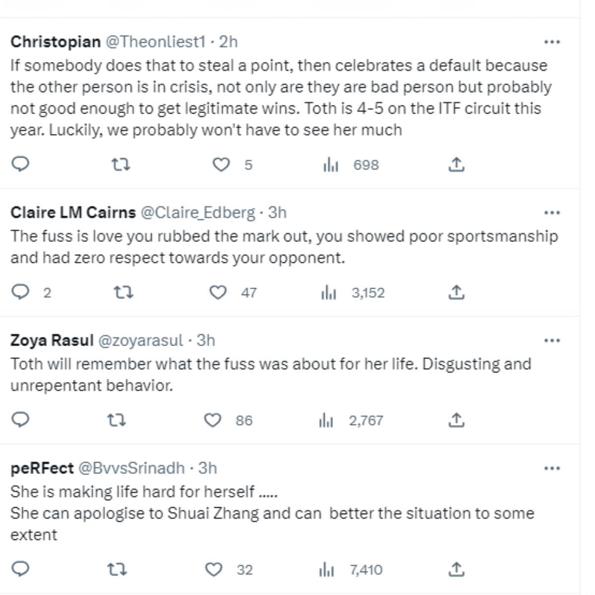 Some suggested that Toth blew her chance of apologizing to Zhang and making amends. One fan even called for Toth to be banned from the WTA Tour altogether.