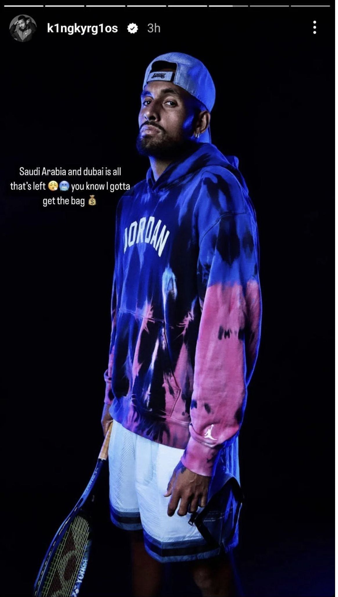 "Saudi Arabia and Dubai is all that’s left, you know I gotta get the bag,” Kyrgios wrote on his Instagram story on Tuesday, alongside a picture of himself .