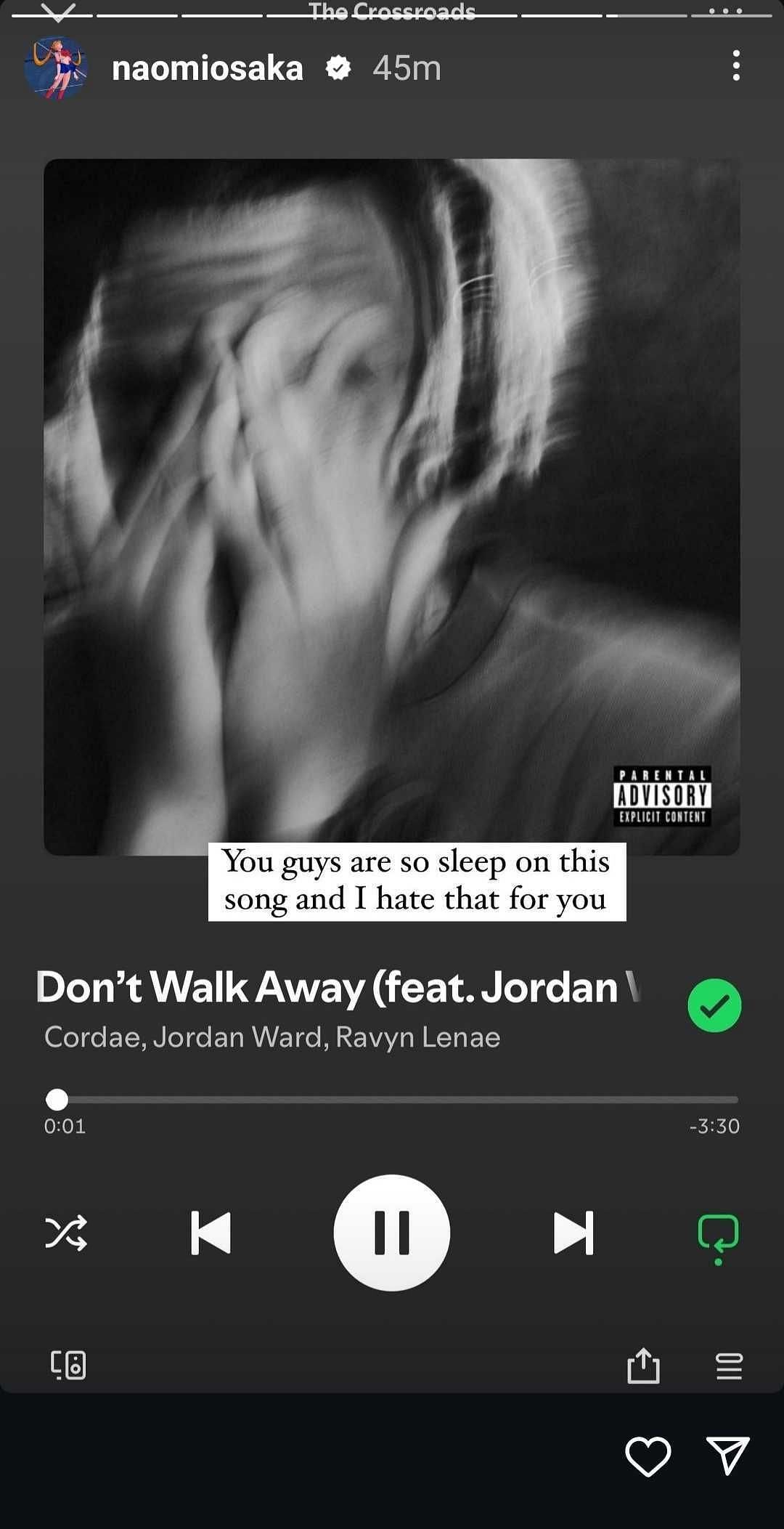 Apart from being Cordae's partner, Naomi Osaka is also an avid fan of the rapper's music. She promoted 'The Crossroads' ahead of its release, and recently took to Instagram Stories to share her enthusiasm for the song "Don't Walk Away", which also features singer-songwriter Jordan Ward and singer Ravyn Lenae. The song, as its name suggests, is about a man urging his partner not to walk away from their relationship.