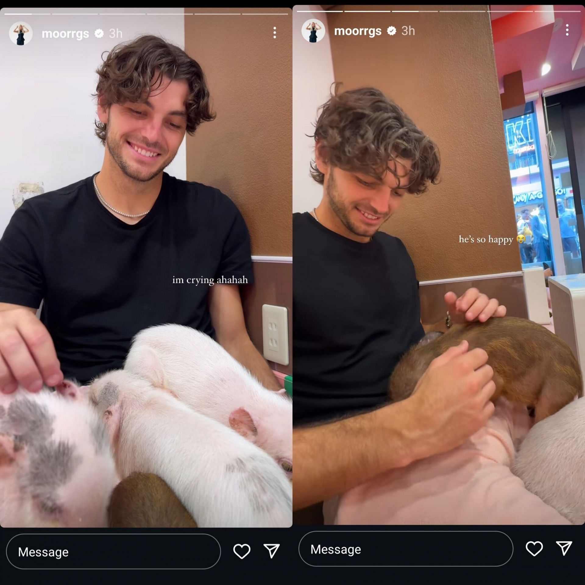 Taylor Fritz and his girlfriend, Morgan Riddle, enjoyed a heartwarming experience during the 2024 Japan Open. The couple visited an animal cafe, where they got to spend some time cuddling with adorable baby pigs.