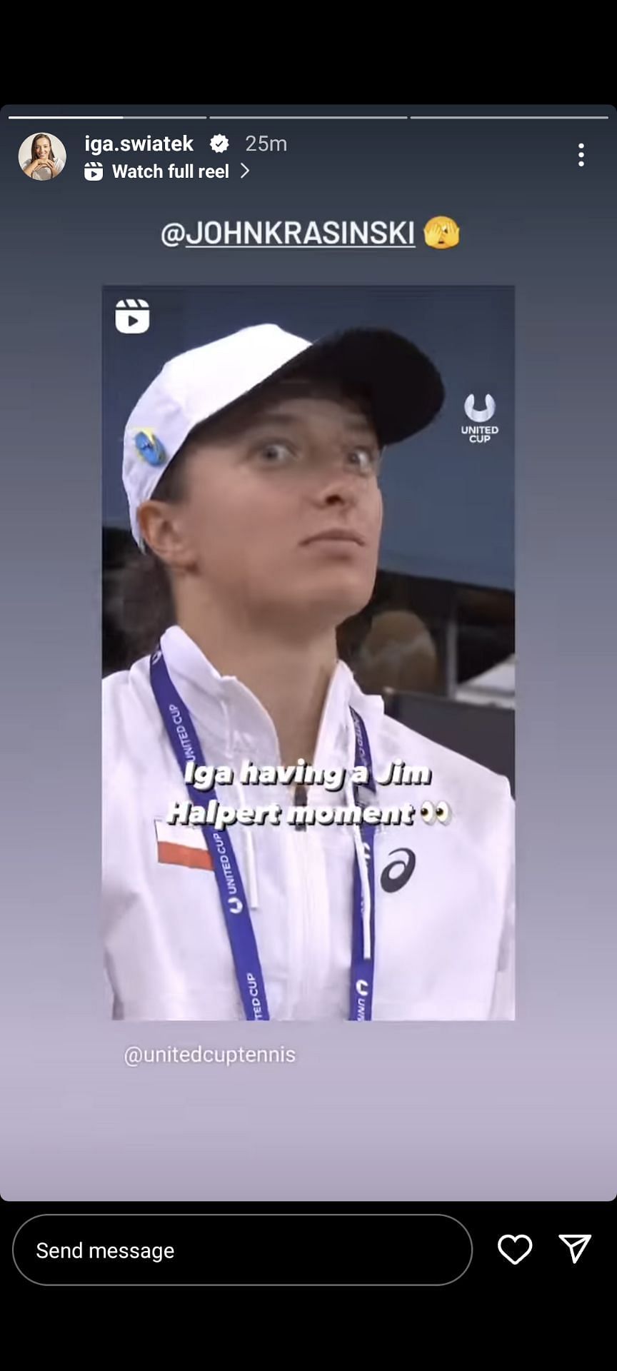 The United Cup later shared the video of the incident and Swiatek reposted the video on her Instagram Stories, tagging American actor John Krasinski, who played Jim Halpert on the show.