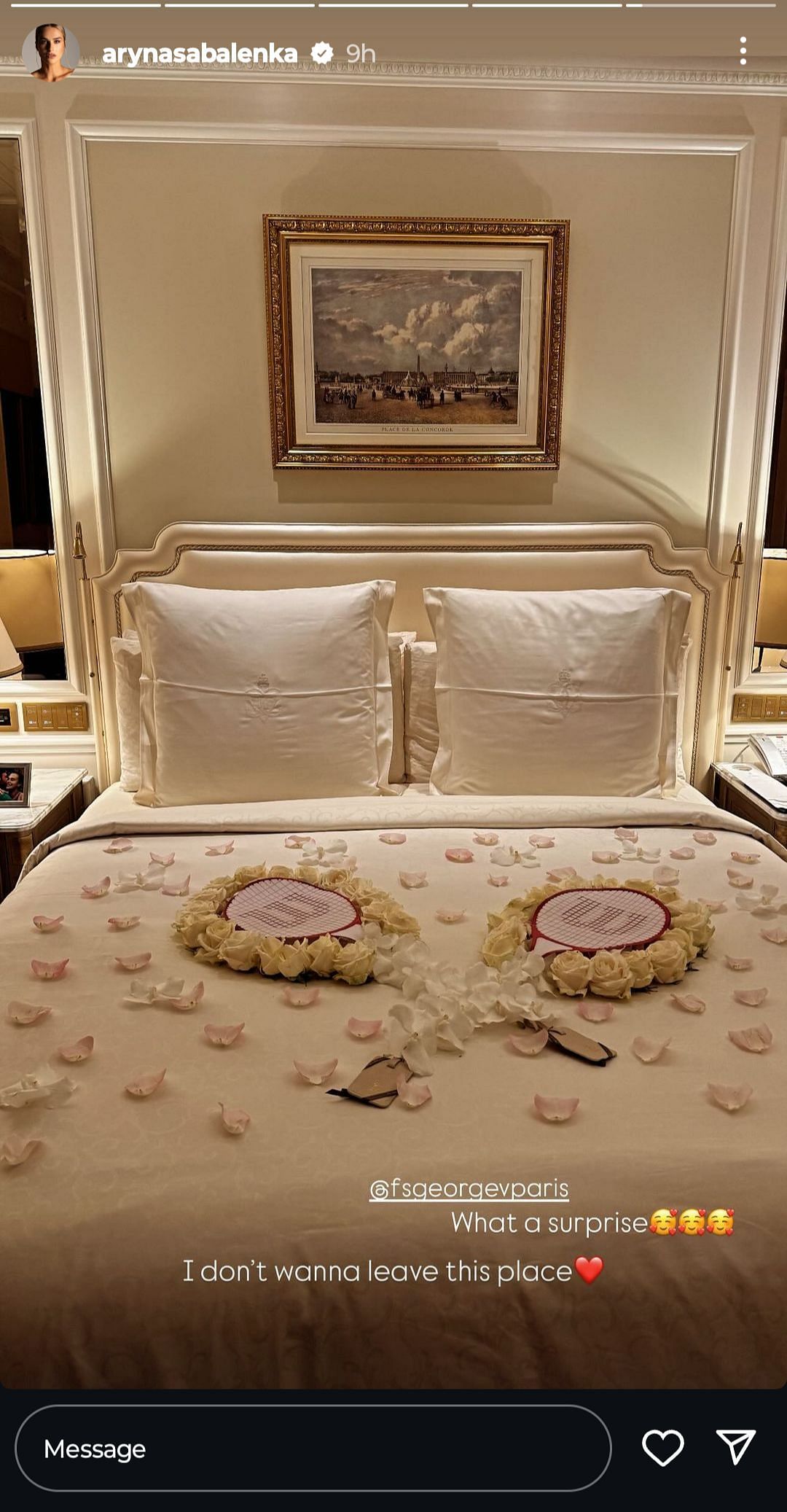 Another picture showed a bed decorated with mock tennis racquets and roses presumably from the Four Season George V in Paris where the couple stayed. Sabalenka captioned it: