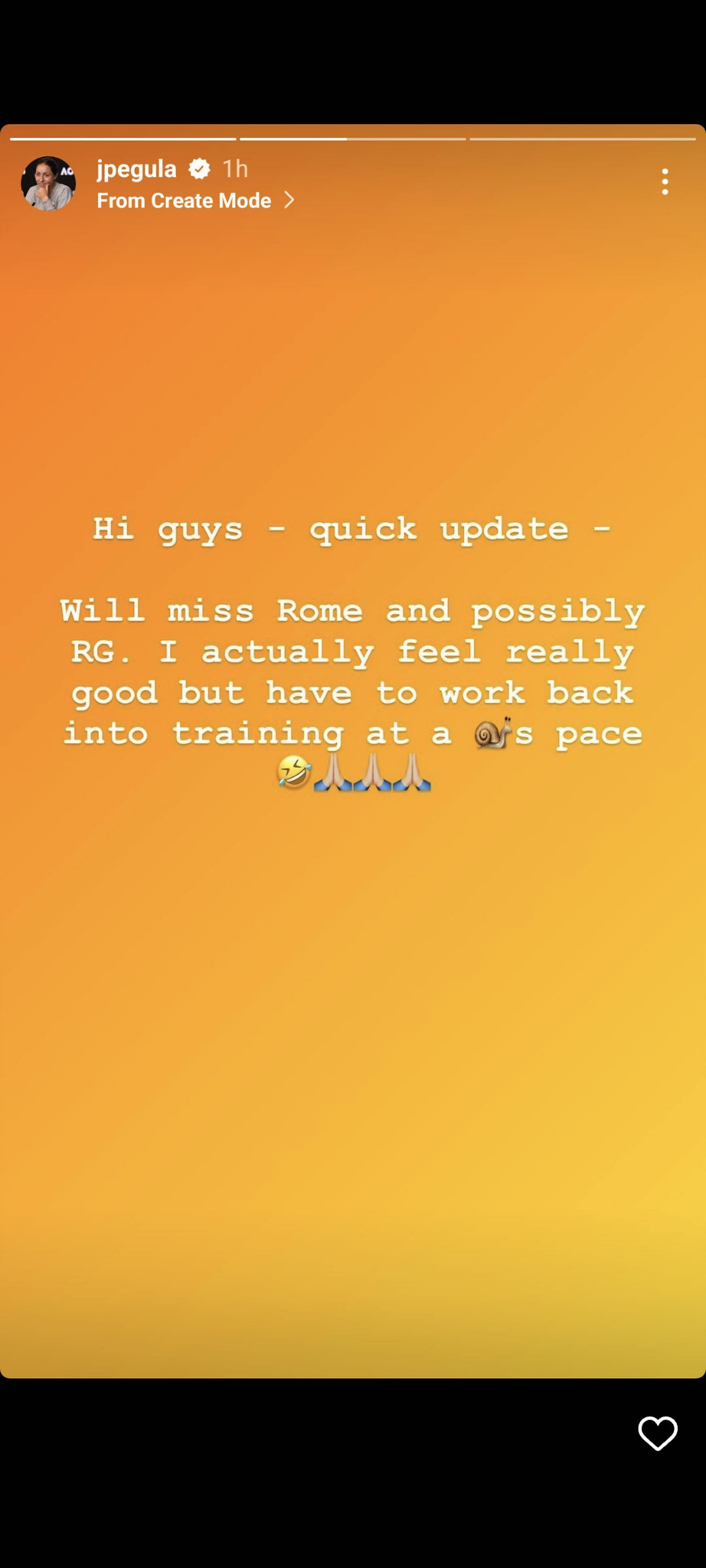 "Hi guys - quick update - Will miss Rome and possibly RG. I actually feel really good but have to work back into training at a 🐌 's pace 😂 🙏🏻 🙏🏻 🙏🏻 " Pegula captioned her Instagram story.