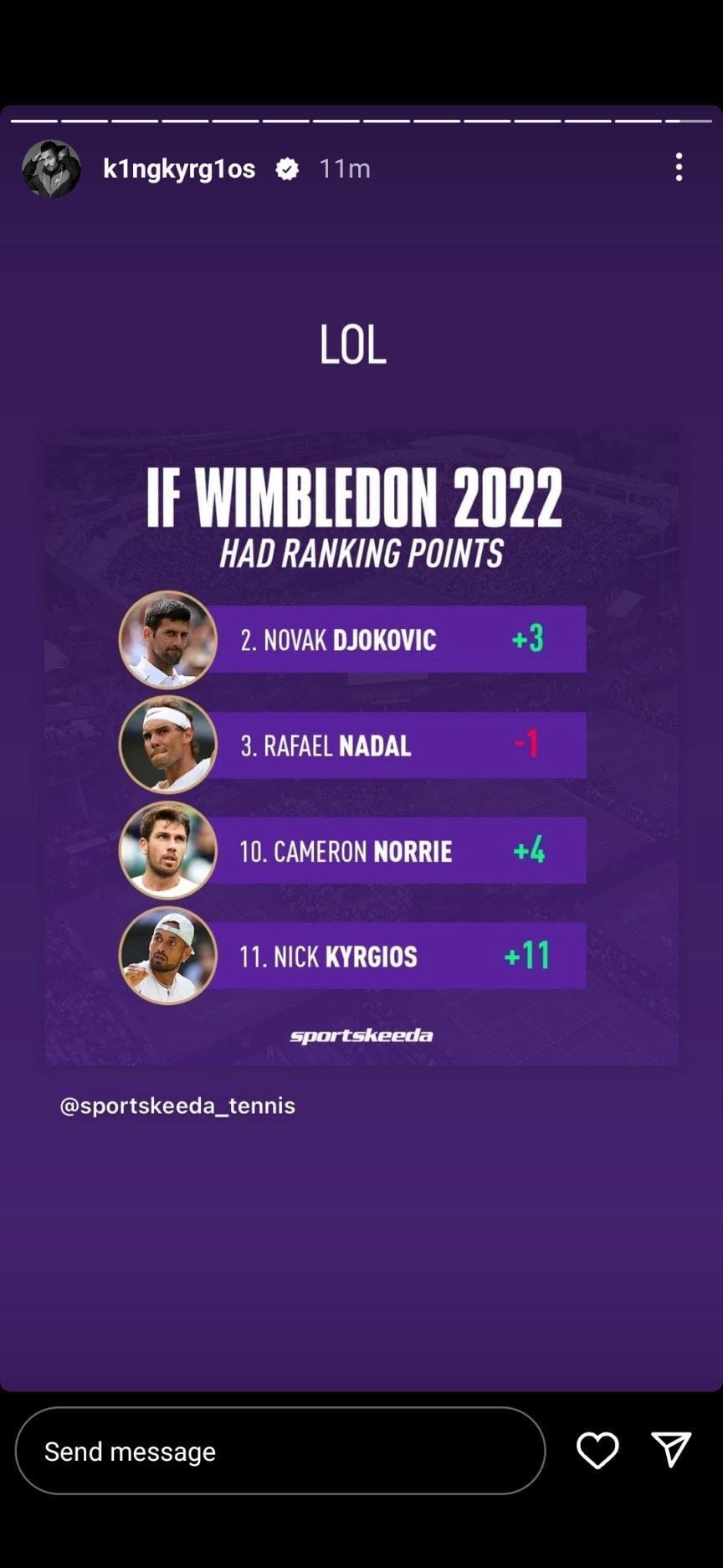 This was accompanied by a Sportskeeda artcard that showed his possible ranking, along with that of Novak Djokovic, Rafael Nadal, and Cameron Norrie, if Wimbledon had given out ranking points.