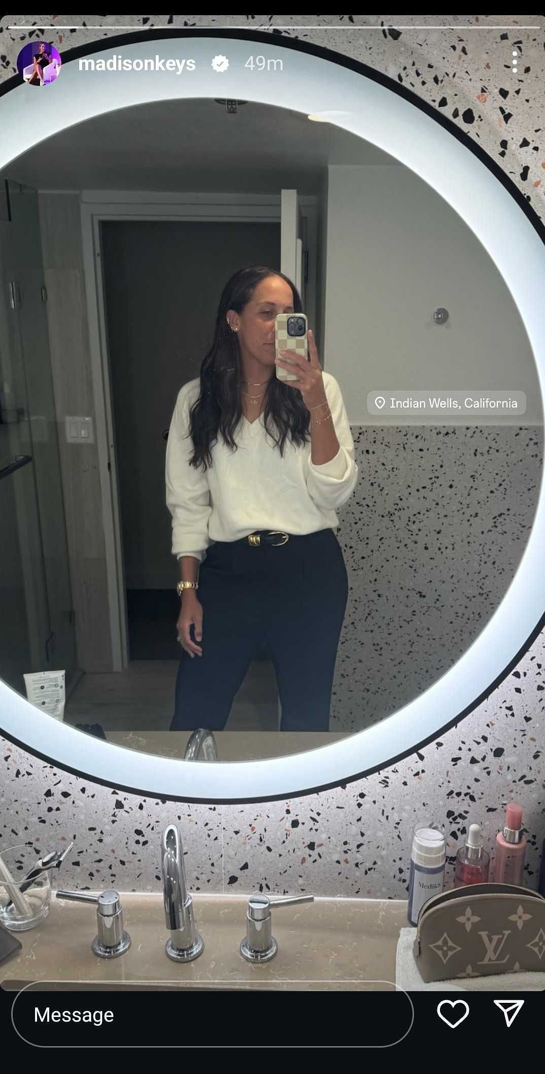 Madison Keys recently informed fans of her arrival at Indian Wells for the upcoming WTA 1000 event. On Saturday, she shared an adorable mirror selfie on her Instagram along with adding a location tag, confirming her arrival in California. Her outfit showcased an off-white top paired up with dark blue denims.