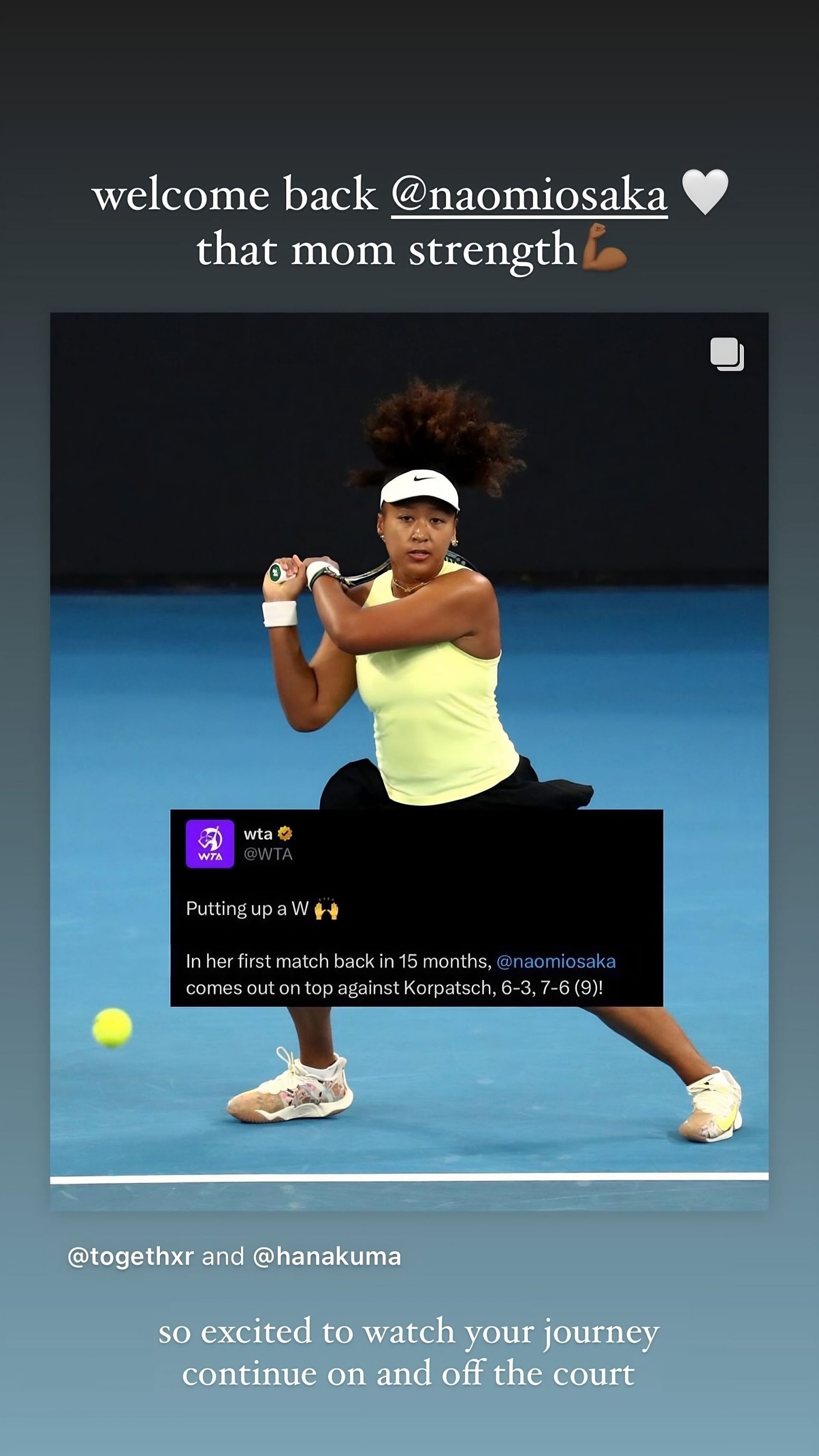 "Welcome back @naomiosaka, that mom strength. So excited to watch your journey continue on and off the court," Felix wrote.