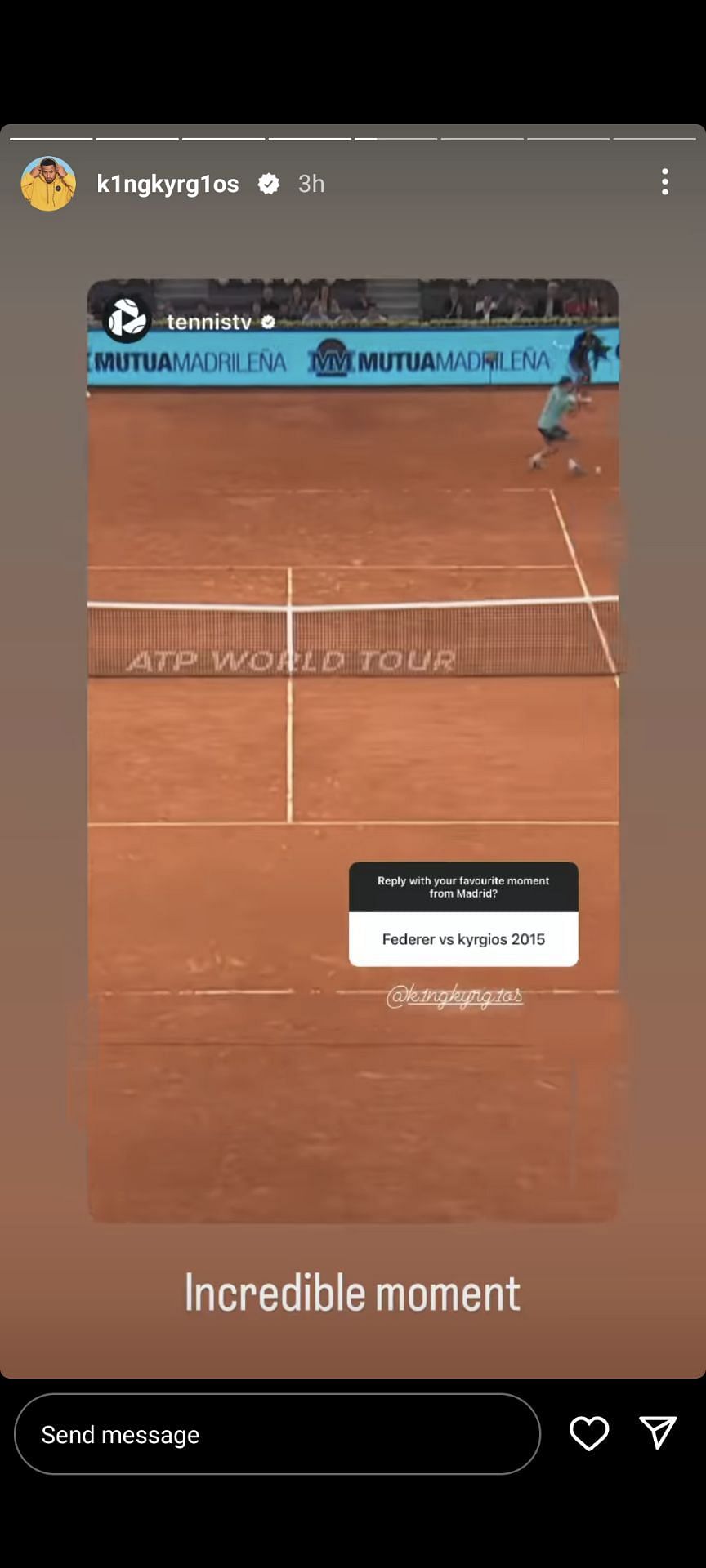 "Incredible moment," Nick Kyrgios wrote alongside his Instagram story.