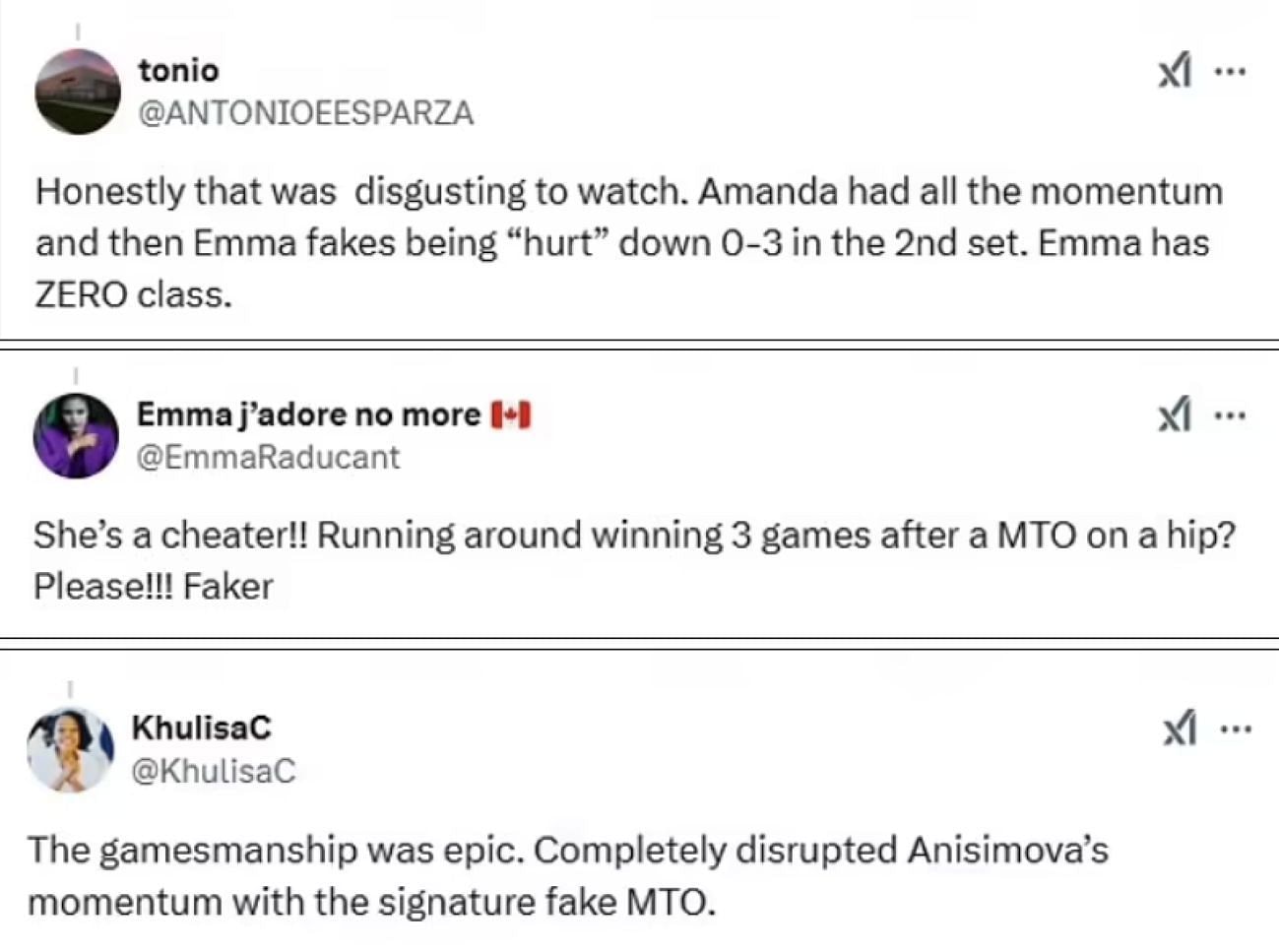 Some of Animisova's fans suggested afterwards that Raducanu had exaggerated a lower back issue to break up play when Anisimova was 3-0 up in the first set. At that juncture, Raducanu called for a physio and received on-court attention. When play restarted, the Brit went on to win the next 3 games and then the set.