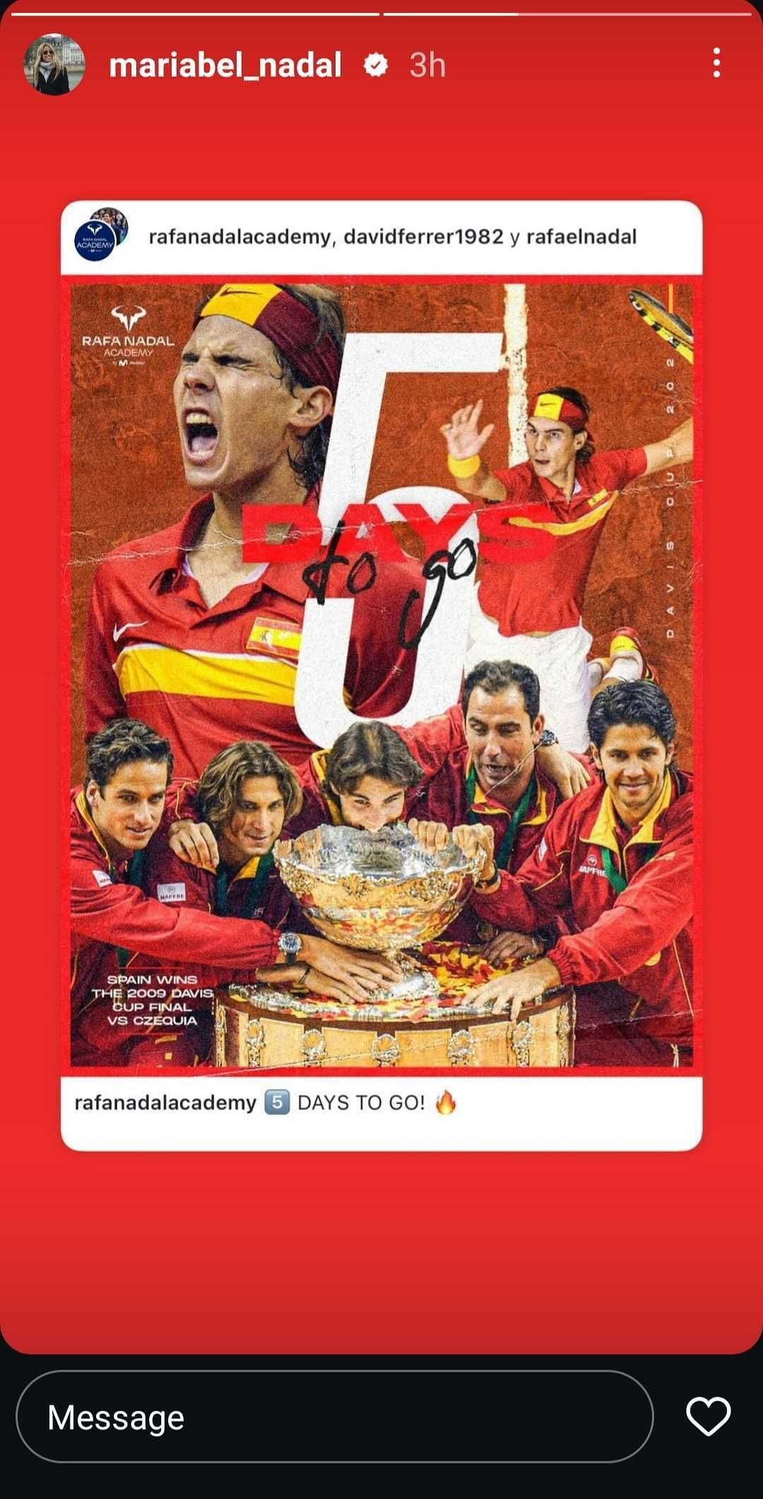 Recently, Maribel took to Instagram to share a picture that was originally shared by the official Instagram handle of the Rafa Nadal Academy. The picture featured the caption '5 days to go', a countdown to the 2024 Davis Cup Finals, where Nadal is set to bid farewell to his stellar tennis career.