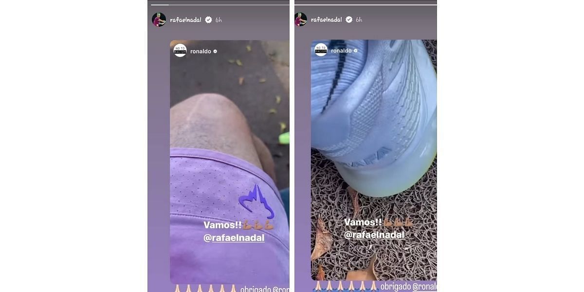On Sunday, Ronaldo posted a video on his Instagram story featuring him sporting purple shorts with Rafael Nadal's logo, a stylized version of a bull. He then captioned the image "Vamos," which means "let's go" in Portuguese. A few hours later, the Spaniard shared the video on his Instagram story and thanked him in Portuguese, saying "obrigado."