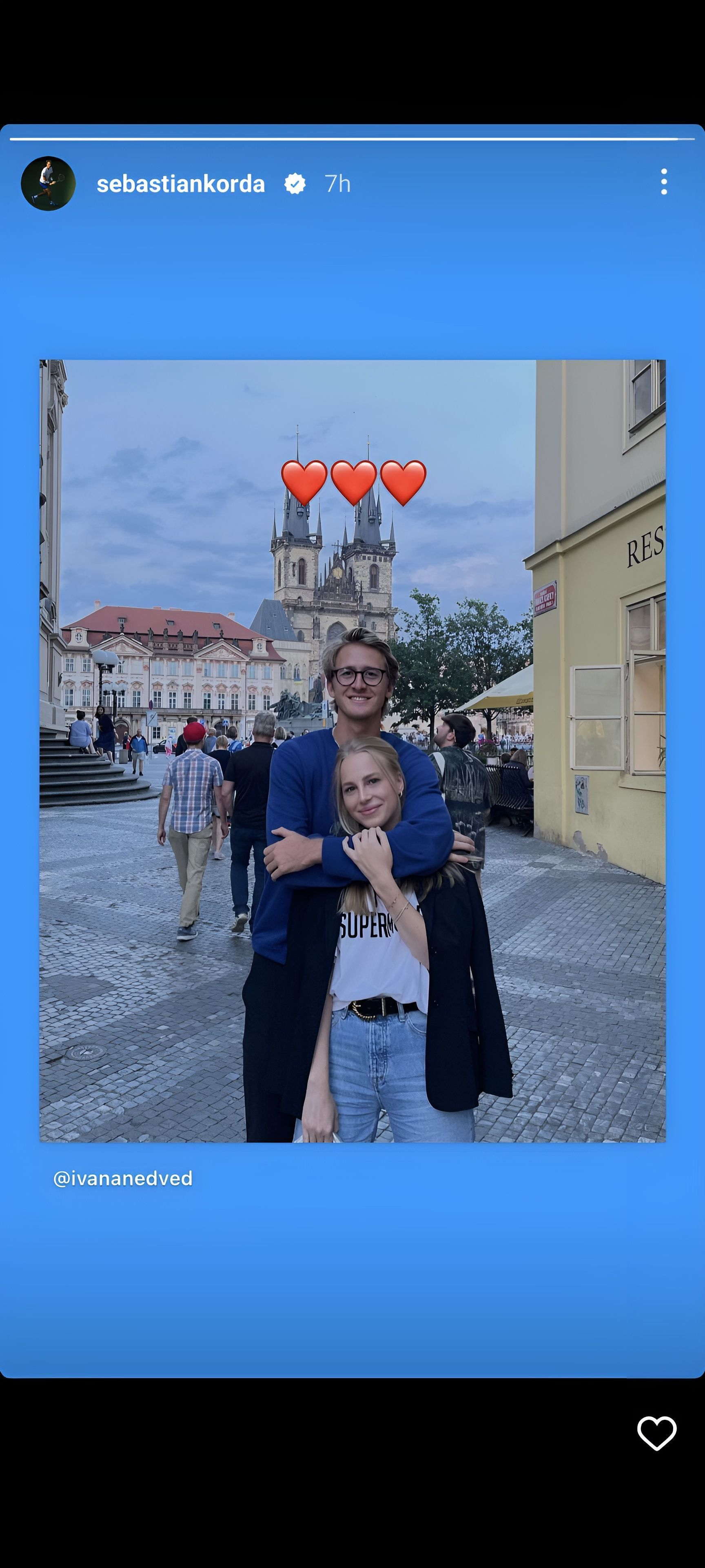 On Monday, June 12, Korda shared a picture with a string of heart emojis on his Instagram story. In the image, he and Nedved were seen posing in front of the Church of Our Lady before Týn, a catholic church in the Czech Republic.