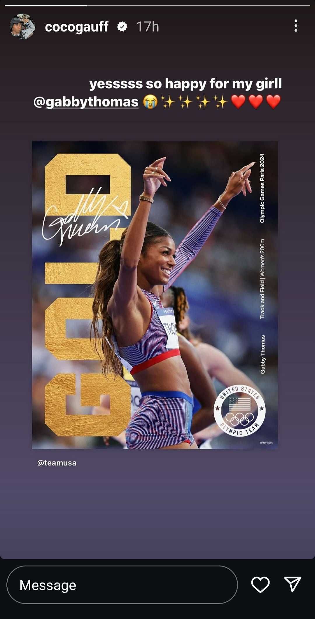Following the women's 200m, Gauff shared a picture on her Instagram story featuring Thomas, 27 and her triumph. Gauff, excited about Thomas’ achievement, captioned the post with:
