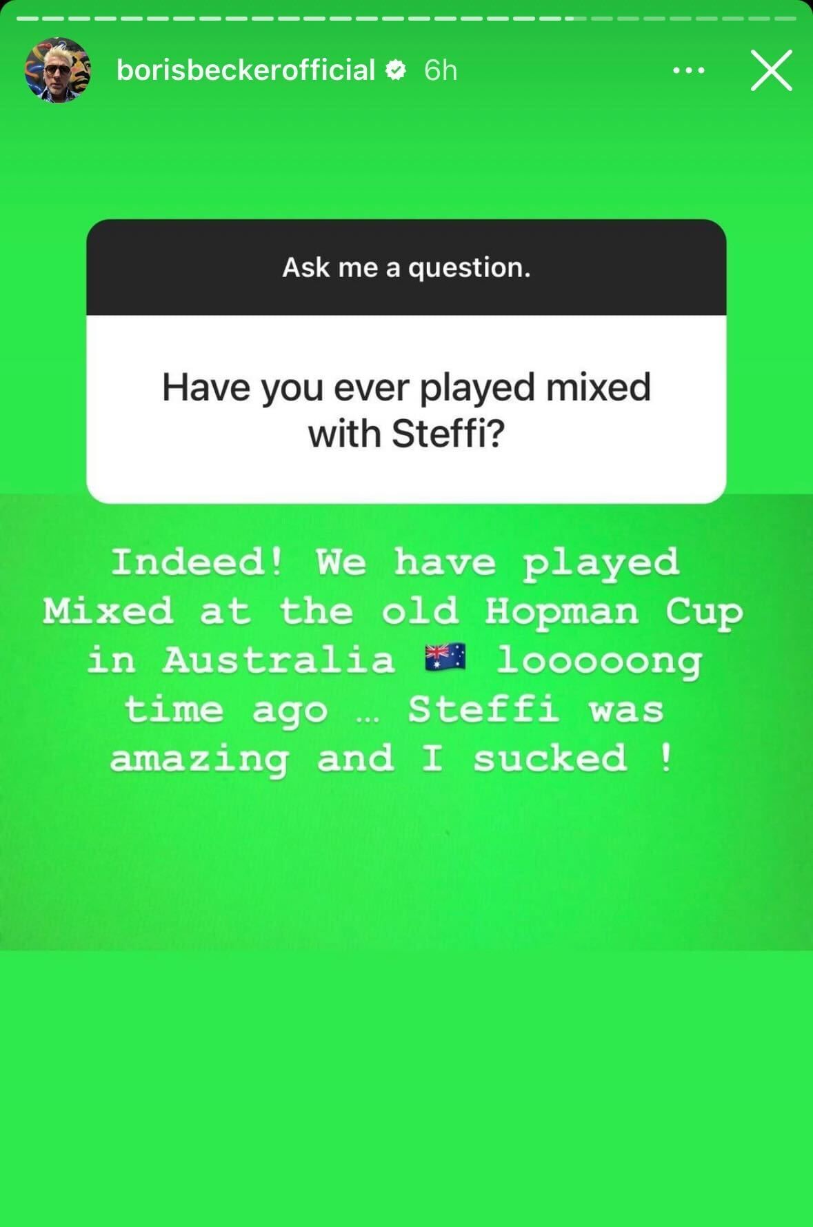 "Indeed! We have played mixed at the old Hopman Cup in Australian looooong time ago. Steffi was amazing and I sucked!" Becker wrote.