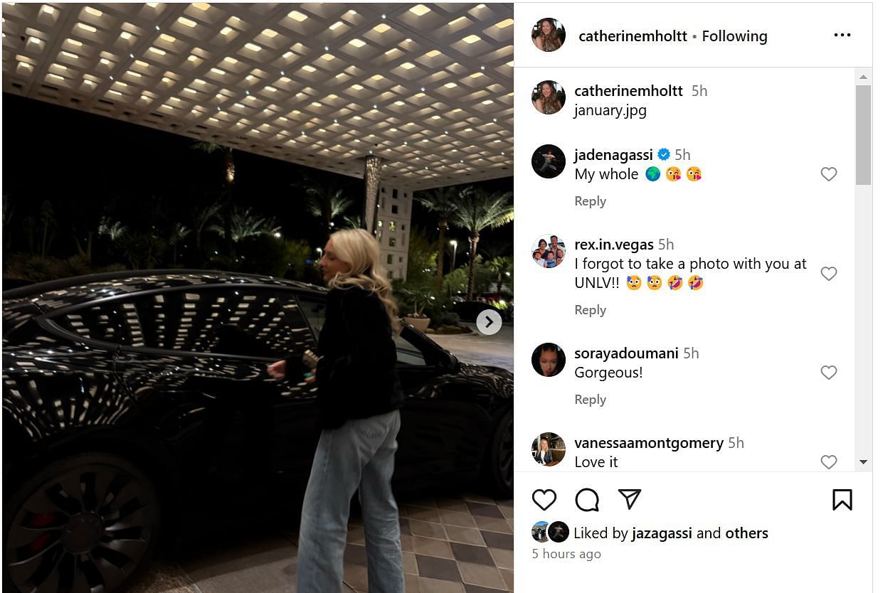 Today, Catherine posted a recap of January, where she combined 12 pictures in one post. In those 12 pictures, she is seen at places like bars, restaurants, hotels, etc. There are multiple pictures of her with friends and Jaden. Though her pictures with Jaden are secretive as his face is not visible, one can figure that it's him. She summed up her wonderful first month of the year in those 12 pictures. On that post, Jaden commented,