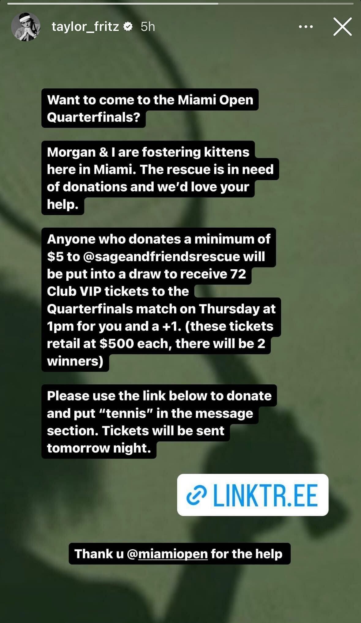 "Want to come to the Miami Open Quarterfinals? Morgan and I are fostering kittens here in Miami. The rescue is in need of donations and we'd love your help. Anyone who donates a minimum of $5 to @sageandfriendsrescue will be put into a draw to receive 72 Club VIP tickets to the quarterfinals match on Thursday at 1 pm for you and a +1," he wrote on Instagram, sharing a link for the donations.