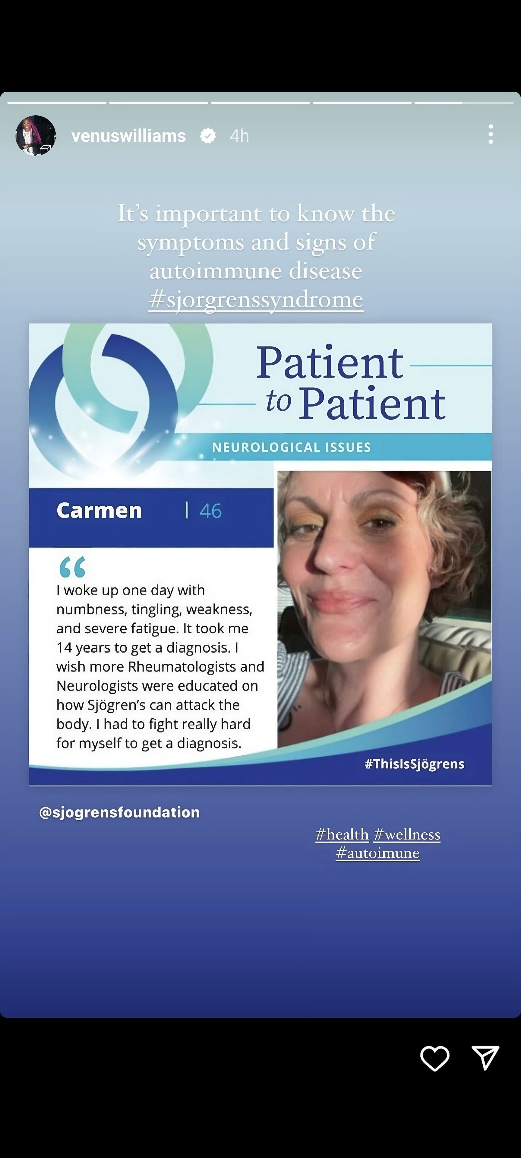 Williams shared a post from the Sjogren’s Foundation, in which a patient described her experience with the disease and how it affects her daily life.