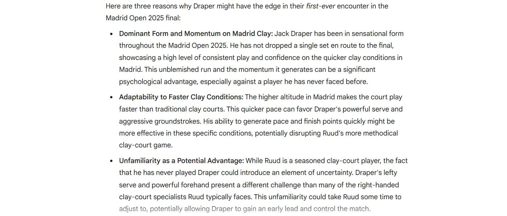 Without further ado, let's take a look at AI's prediction for the upcoming final in the Madrid Open. As per Google's Gemini AI, Draper is a slight favorite to lift the title. Here are the three reasons why: