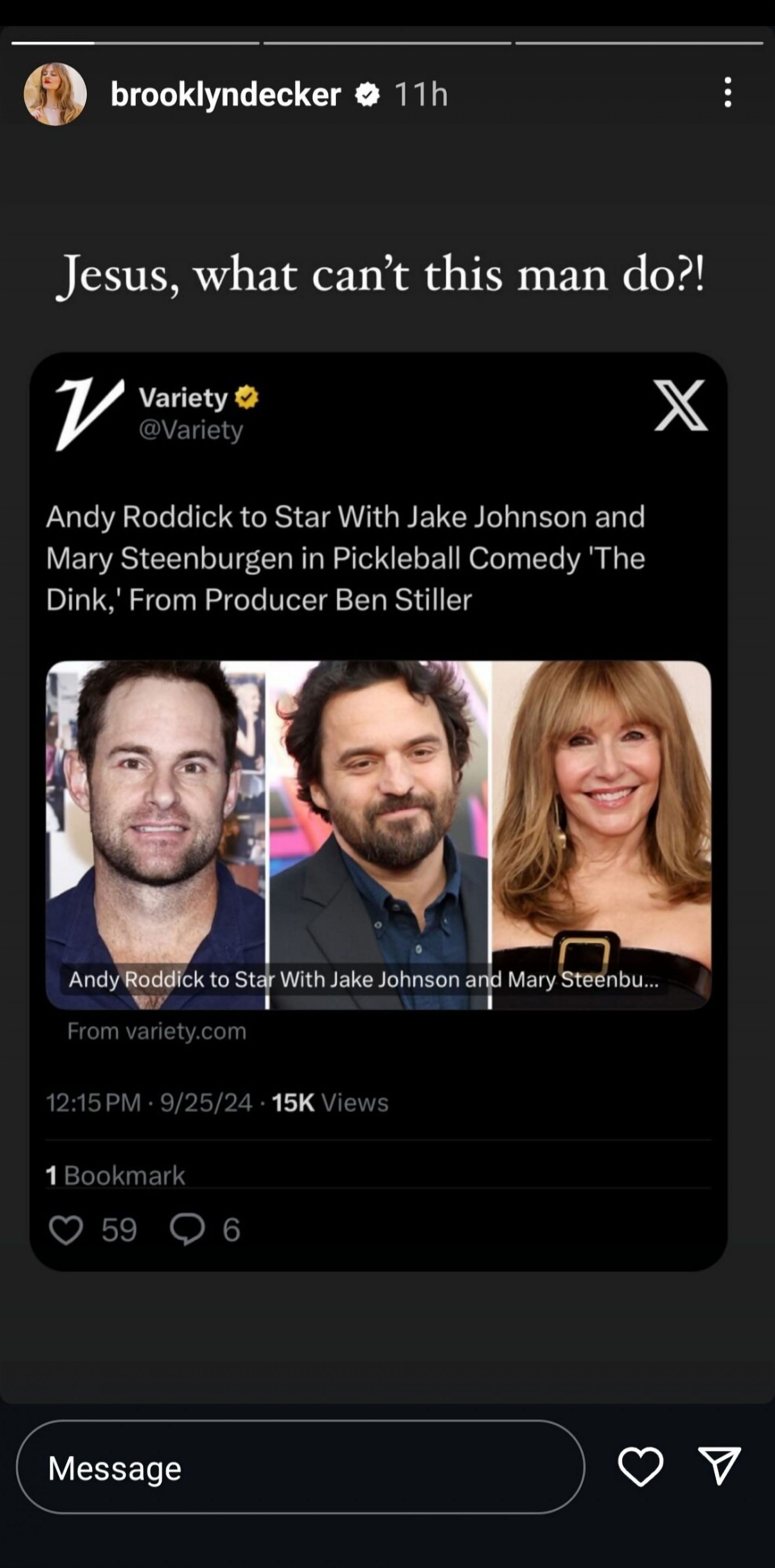 Following the news of Roddick starring in the pickleball comedy film, The Dink coming to light, his wife Brooklyn Decker took to social media to express her admiration for her husband's versatility and talent.
