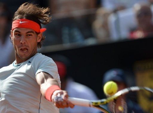 Spain’s Rafael Nadal returns a ball to Czech Republic’s Tomas Berdych during their Rome Masters semi-finals tennis match on May 18, 2013. Nadal set up a potential Rome Masters final with Swiss rival Roger Federer after dominating Berdych 6-2, 6-4 in the semi-finals.