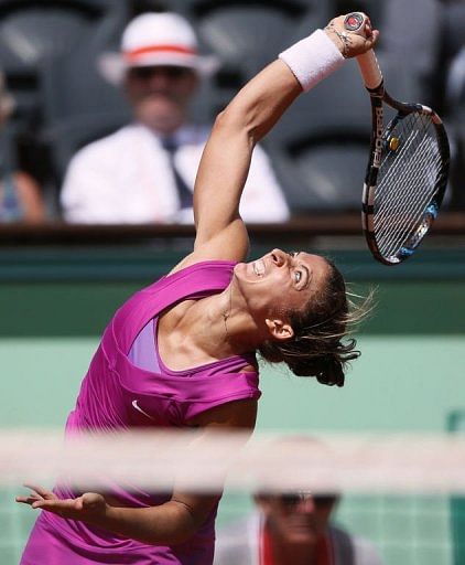 Italy’s Sara Errani serves to Australia’s Samantha Stosur during their Women’s Singles semifinal tennis match of the French Open tennis tournament at the Roland Garros stadium in Paris. Maria Sharapova and Errani will contest the French Open final on Saturday in what will be a first ever meeting between the two 25-year-olds.