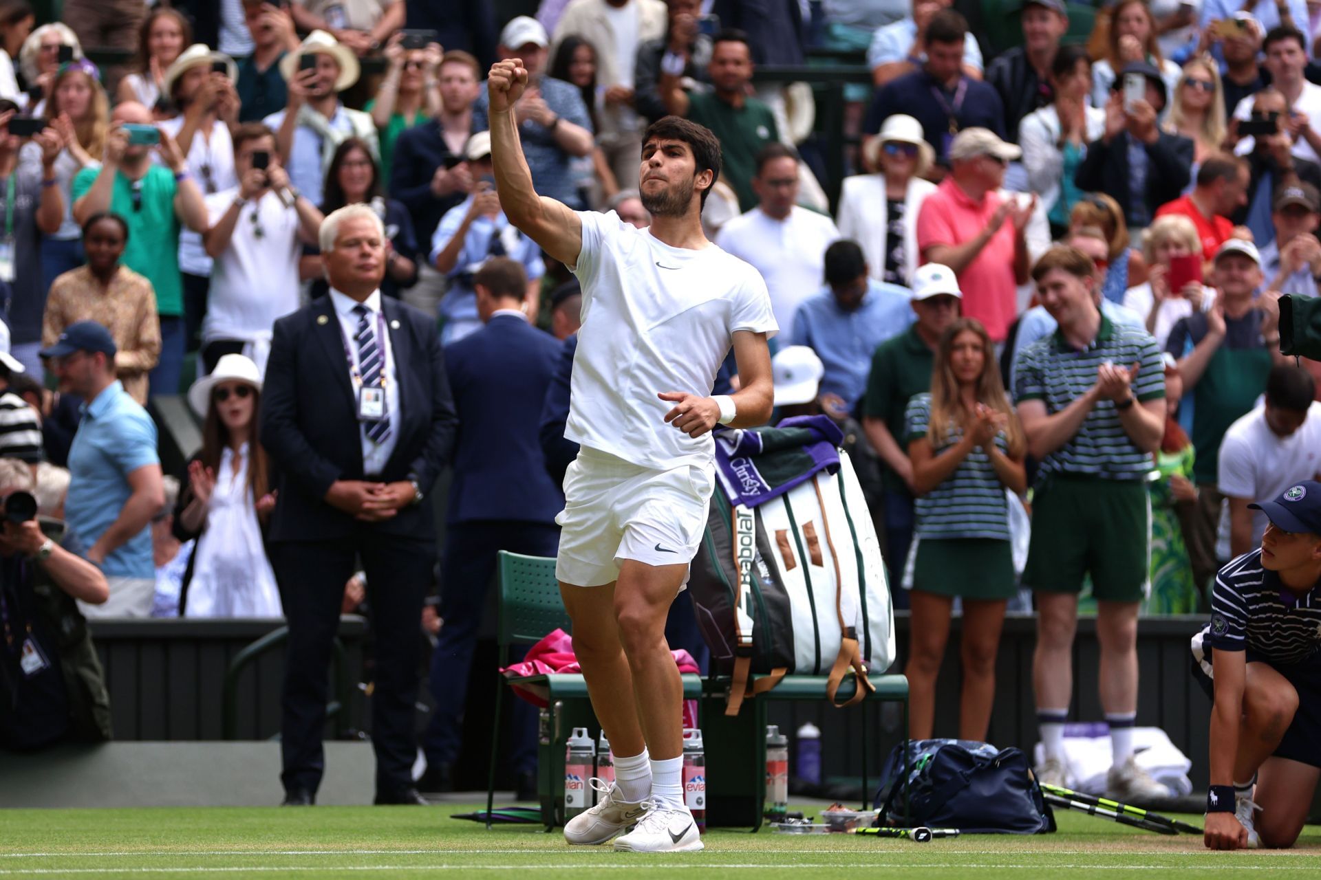 Alcaraz started his campaign at the grass-court Major with straight-set wins over Jeremy Chardy and Alexandre Muller. He triumphed 6-3, 6-7(8), 6-3, 7-5 over 25th seed Nicolas Jarry before beating Matteo Berrettini 3-6, 6-3, 6-3, 6-3 to book his place in the quarterfinals.