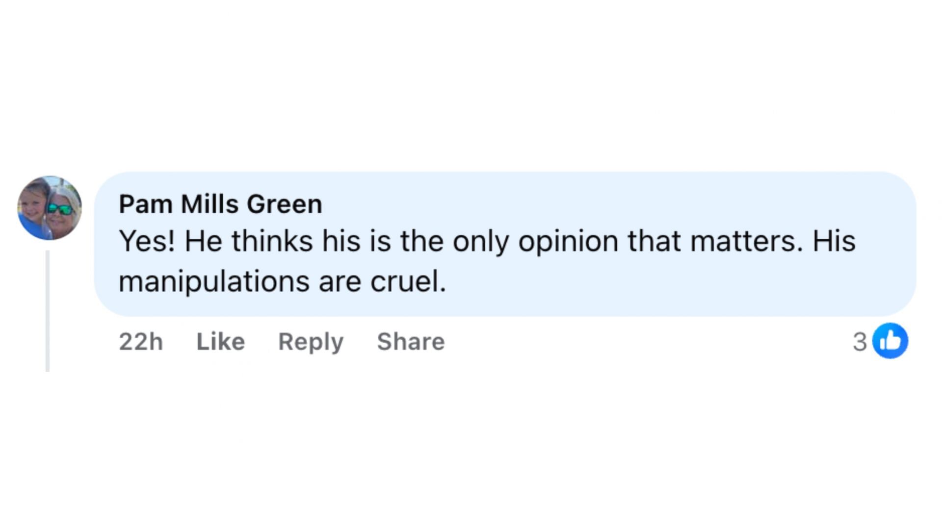 “Yes! He thinks his is the only opinion that matters. His manipulations are cruel.”