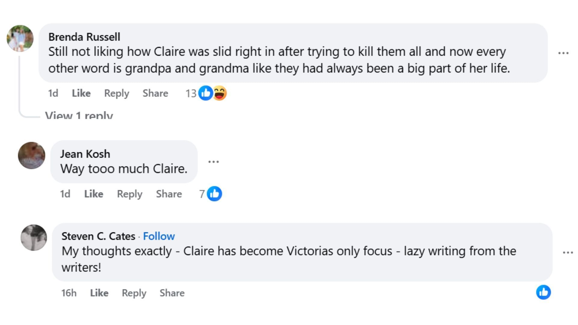 On the other hand, some fans of The Young and the Restless commented how they still do not like Claire, and how she has become Victor's main focus on the soap opera. They also believe it is lazy on the writer's part. They wrote,