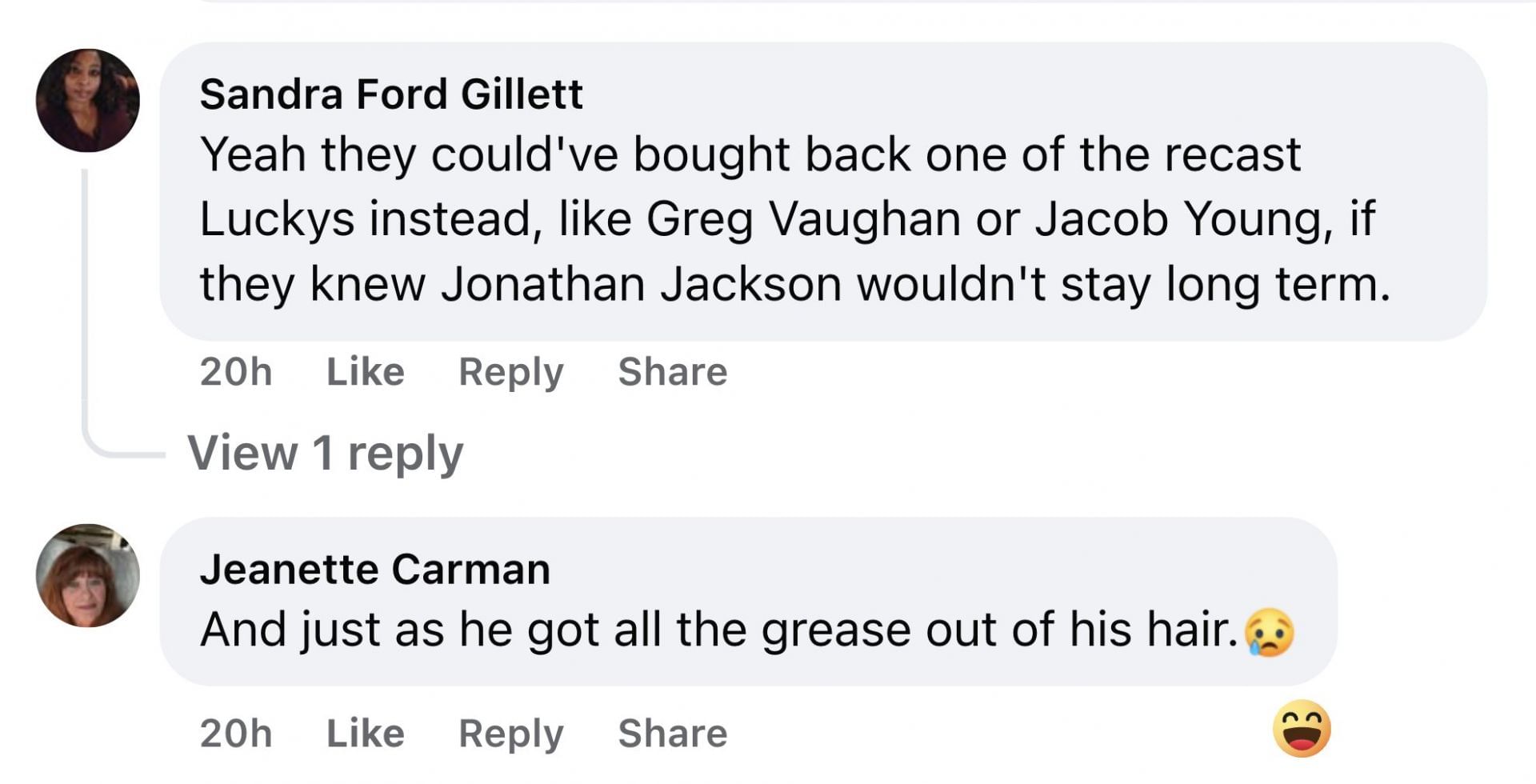 One Facebook user said that suggested that the creators could have brought back one of the recast versions of Lucky, like Greg Vaughan or Jacob Young. Another fan also made a joke about how Jackson's appearance improved right before he left, referring to his hair looking better.