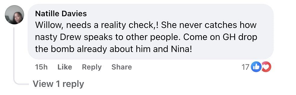 One fan criticized Willow for not noticing Drew’s behavior and pushed for the truth about him and Nina's intention to be revealed. The comment suggests Willow is unaware and overdue for a wake-up call.
