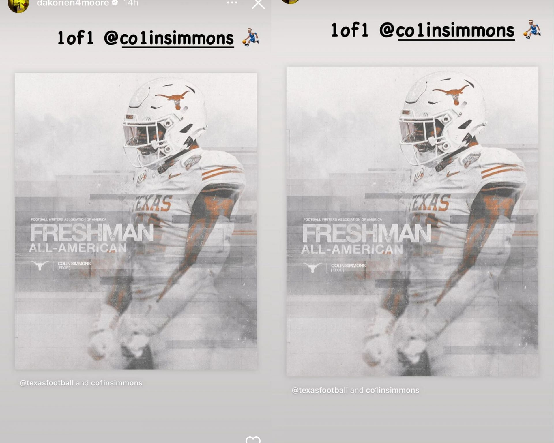Oregon Ducks signee Dakorien Moore congratulated his former teammate, Texas Longhorns freshman Colin Simmons, on being named a Freshman All-American. The edge rusher received this honor from the Football Writers Association of America in an announcement made on Tuesday. Moore shared the news on his Instagram story with the caption: