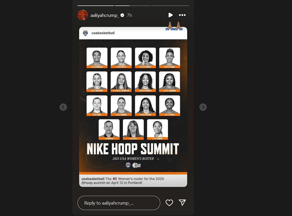 Five-star Longhorns signee Aaliyah Crump is the second-ranked small forward in the Class of 2025 and is also ranked second in the state of Minnesota. On Wednesday, Crump shared a post by USA Basketball which announced that she was part of the USA Women's roster for the Nike Hoop Summit in April.