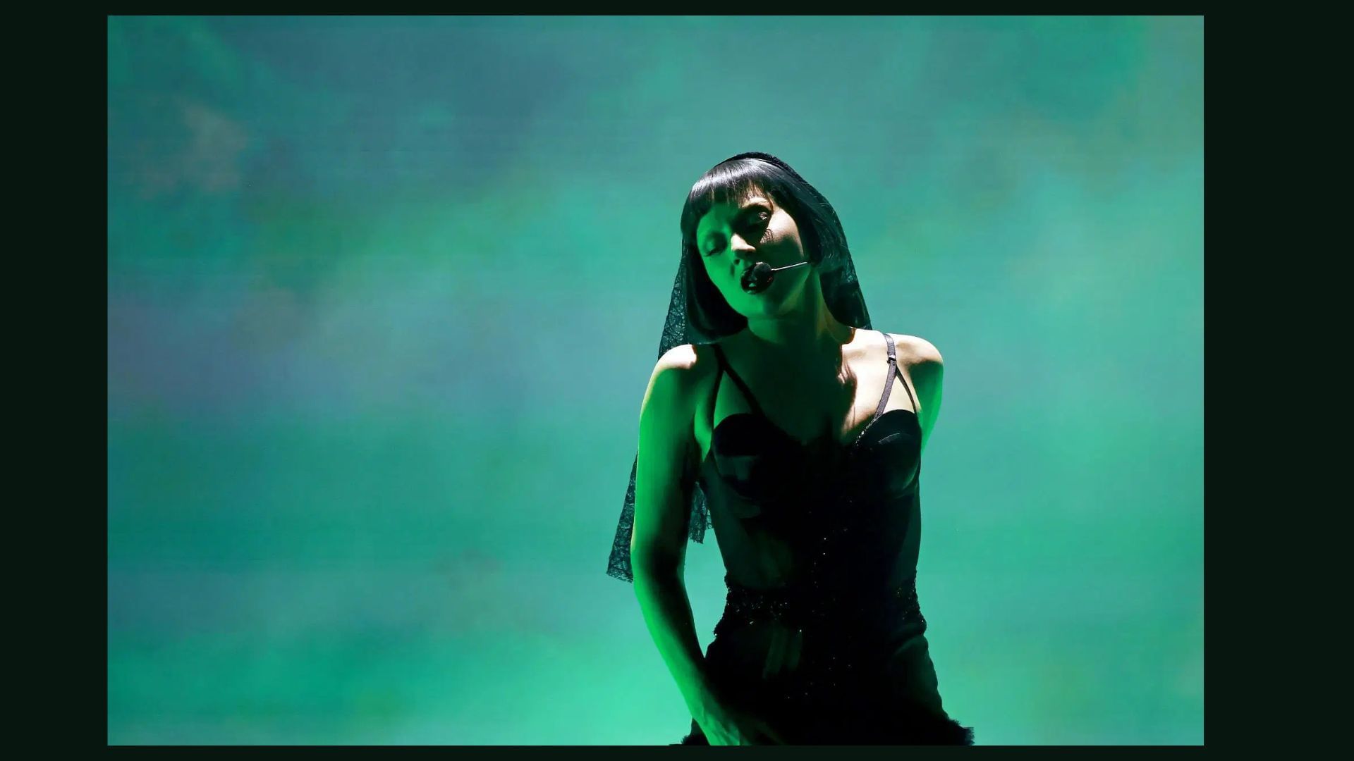 With her black bodysuit-style corset, paneling, and lace trim, the pop star adopted a dark romantic look. Her black veil down blunt bob haircut provided an element of mystery and drama for the look and gave it a futuristic touch.