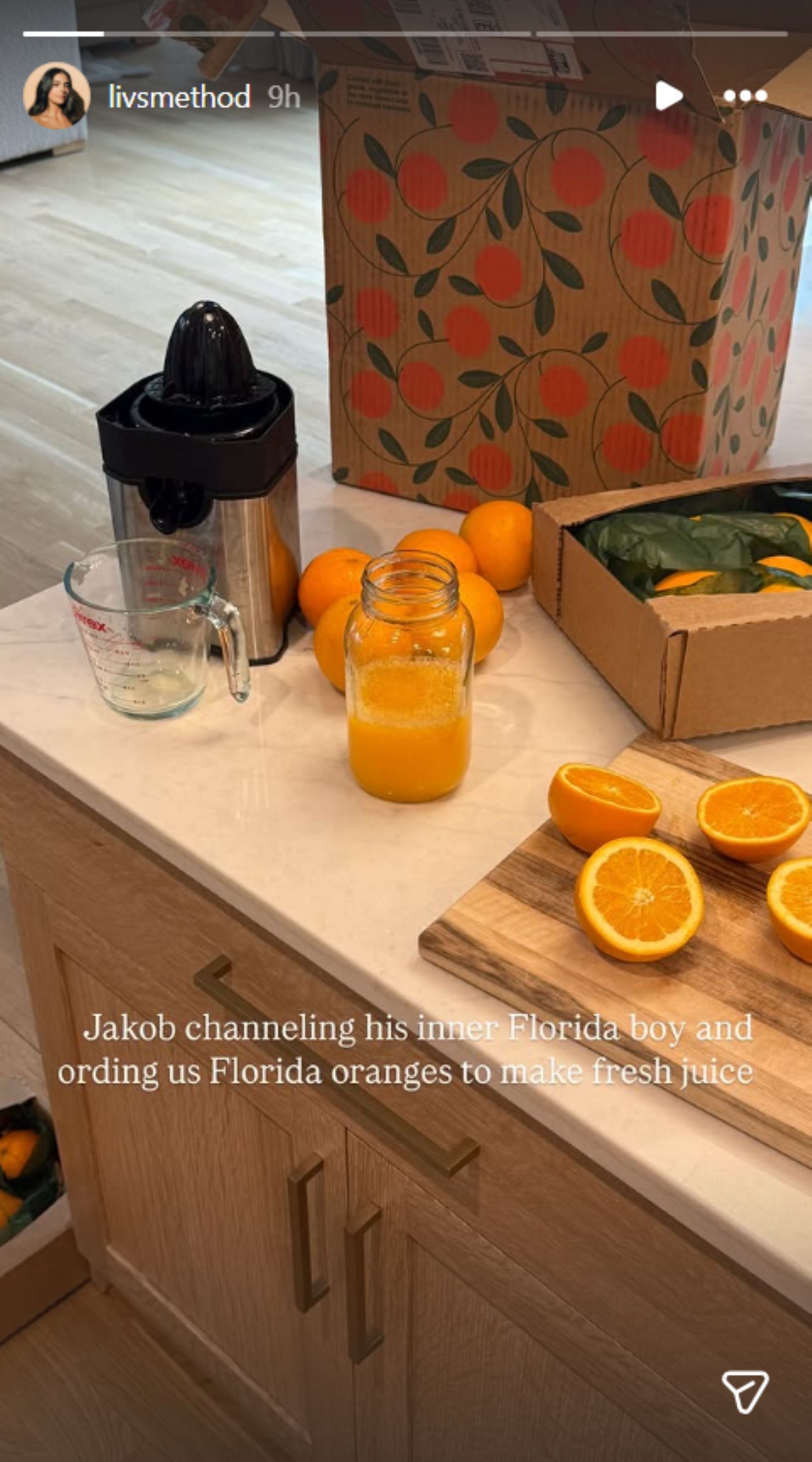 In another post, Olivia shared a video of the couple's dog, Luna, excitedly licking up the orange juice bottle.