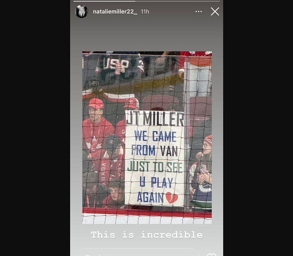 J.T. Miller’s wife, Natalie Miller, shared a special fan moment on her Instagram Story during the USA vs. Canada game. She posted a picture of a fan holding a sign for J.T. at Bell Centre in Montreal on Saturday.