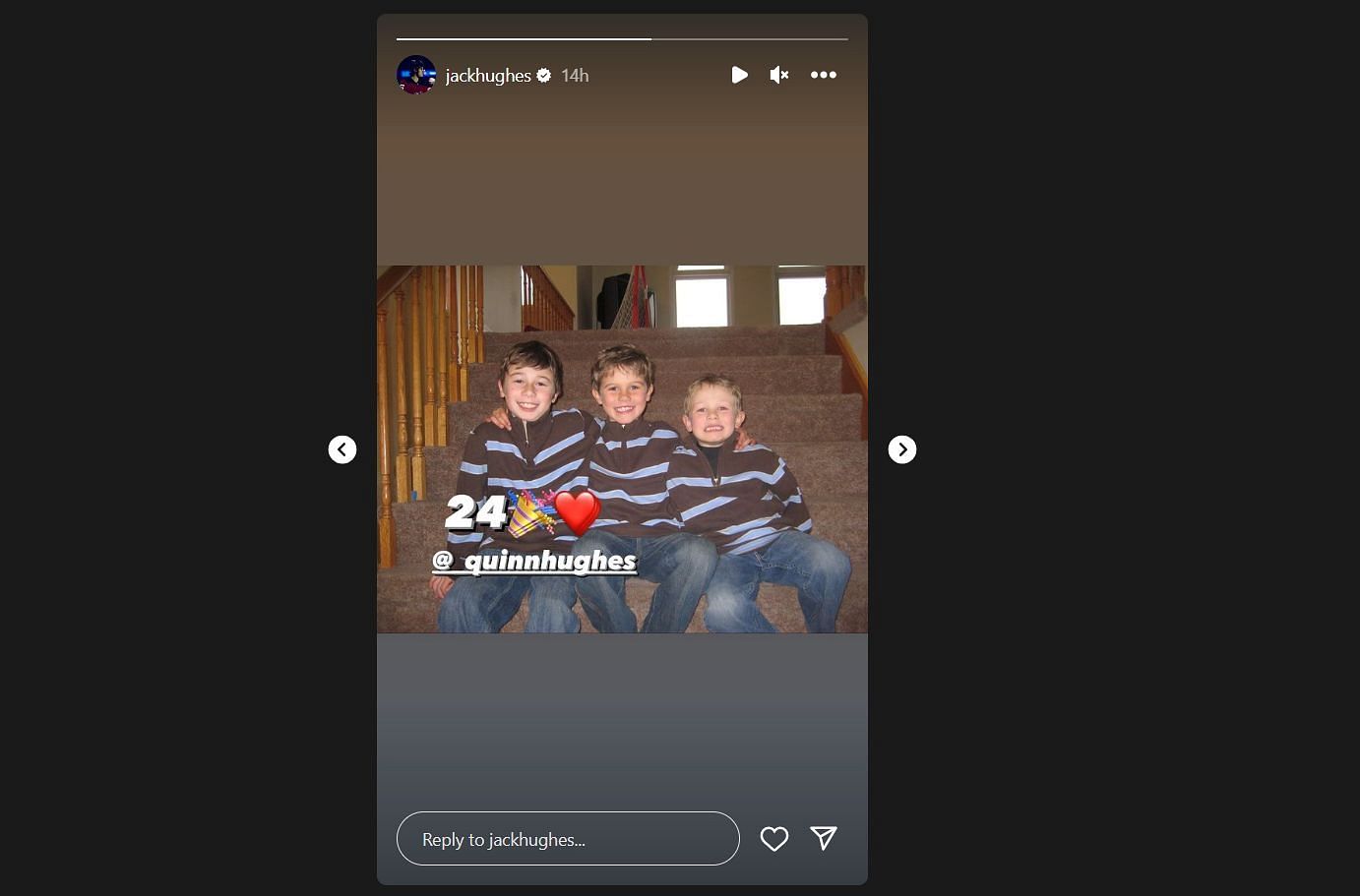 Jack Hughes, the American professional ice hockey center and alternate captain for the New Jersey Devils of the NHL, recently took to his Instagram stories to celebrate his older brother Quinn Hughes's 24th birthday in the most heartwarming way. Jack shared an adorable childhood photo featuring not only Quinn but also their younger sibling, Luke Hughes.