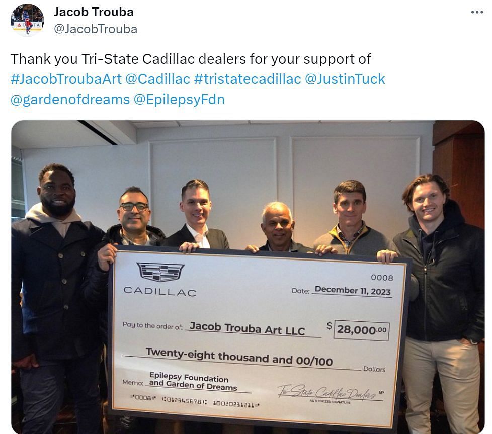 New York Rangers defenseman Jacob Trouba took to X (formerly Twitter) to express his gratitude to Tri-State Cadillac dealers for their generous support of his charitable initiative, Jacob Trouba Art.