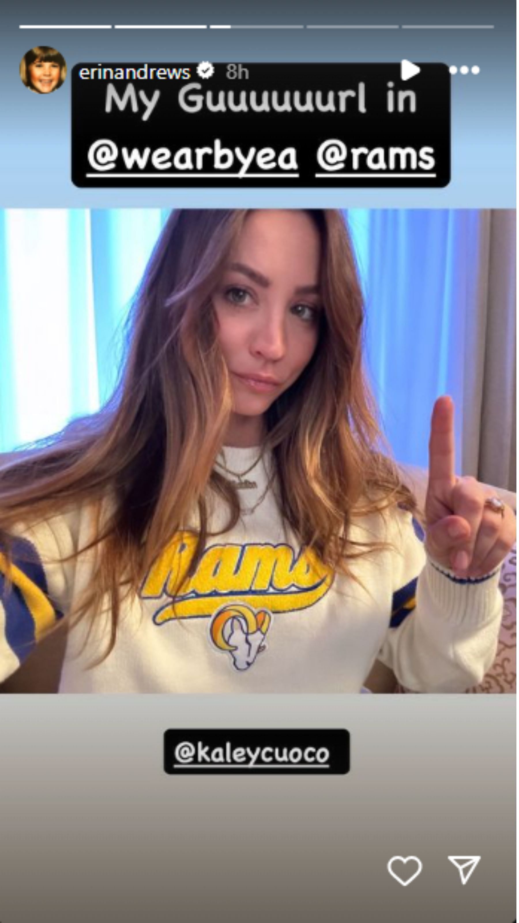 On Wednesday, Andrews shared two Instagram stories featuring Hollywood personalities Kaley Cuoco and Olivia Culpo sporting items from her collection. The first story featured ‘The Big Bang Theory’ star Kaley Cuoco wearing the Los Angeles Rams Stripe Pullover Sweater, a $75 cream-colored stylish top with team stripes.