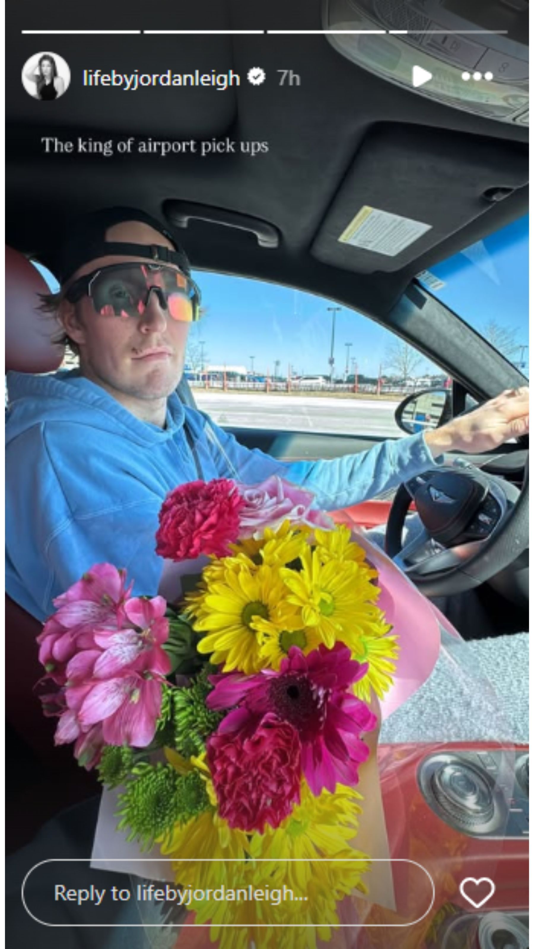 Jordan Leigh shared an Instagram story on her way back from the airport this weekend. It showed Patrik Laine driving a car while wearing a blue hoodie, black cap and reflective sports sunglasses, while Jodan clicked it from the passenger’s seat.