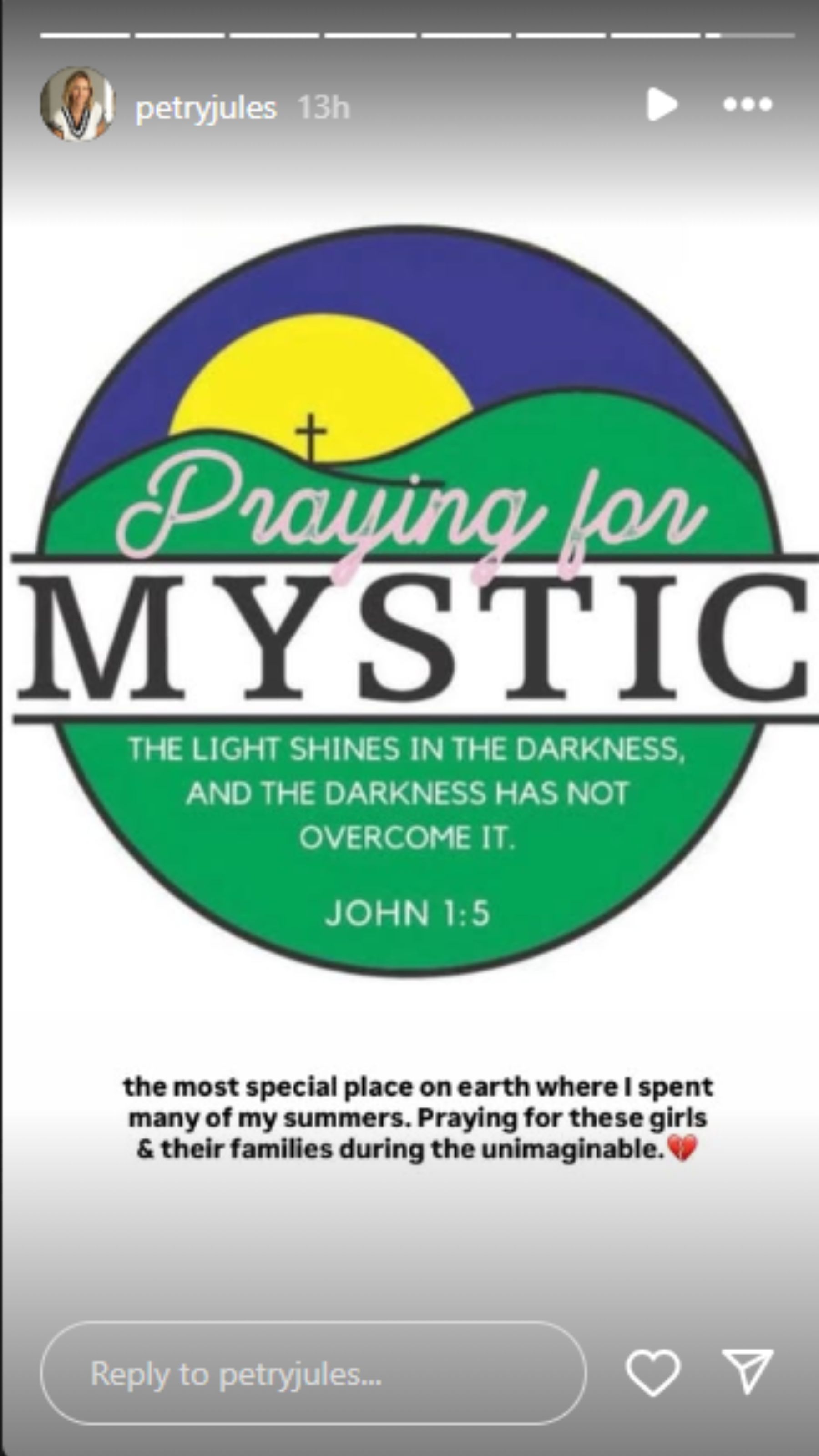“The most special place on earth where I spent many of my summers. Praying for these girls & their families during the unimaginable,” with a broken heart emoji.