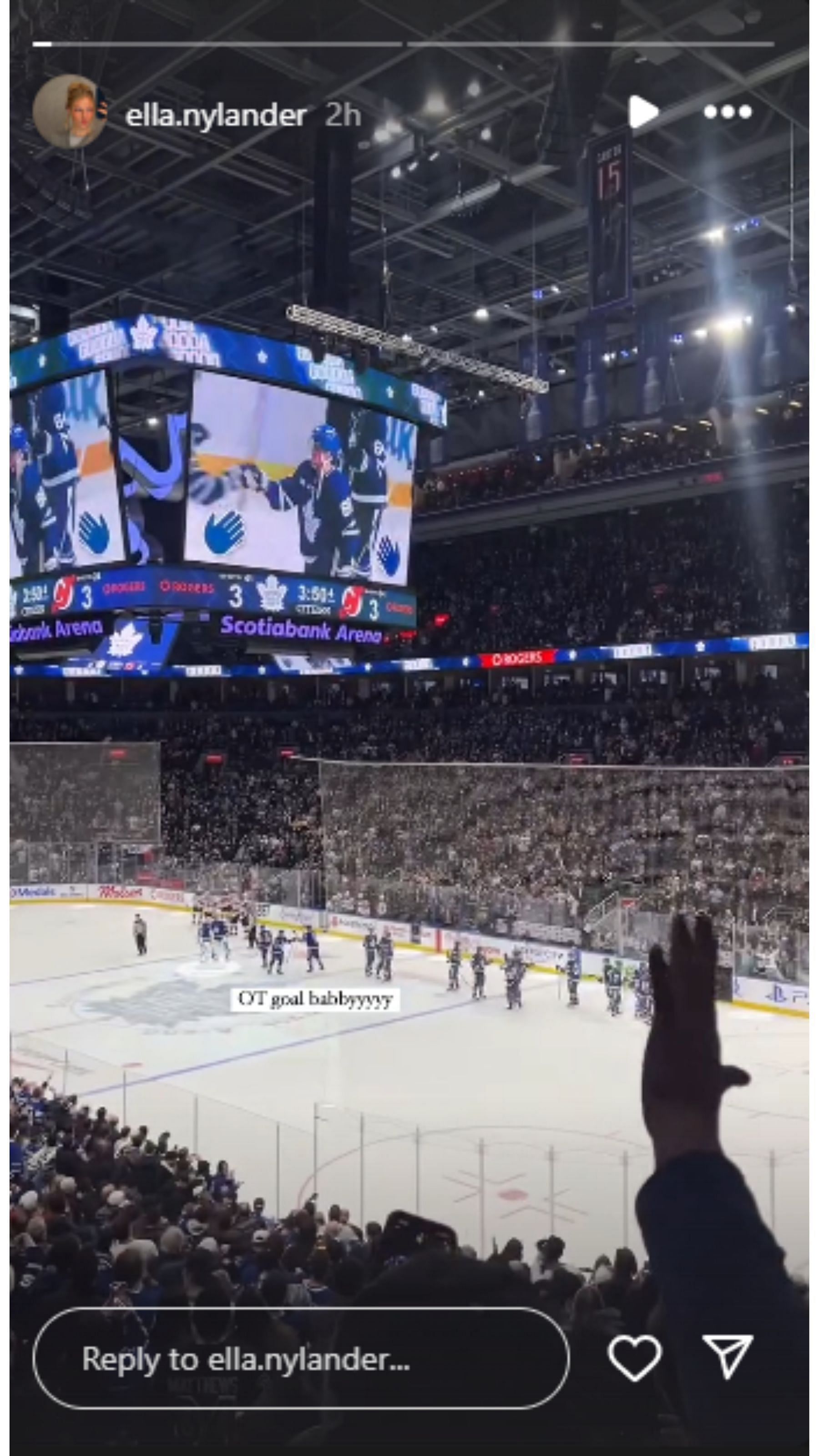 After William scored the winning goal, Ella shared a clip on her Instagram story. Just 70 seconds into overtime, Mitch Marner delivered a perfect stretch pass to Nylander, who beat Devils goalie Jacob Markstrom to seal the win.