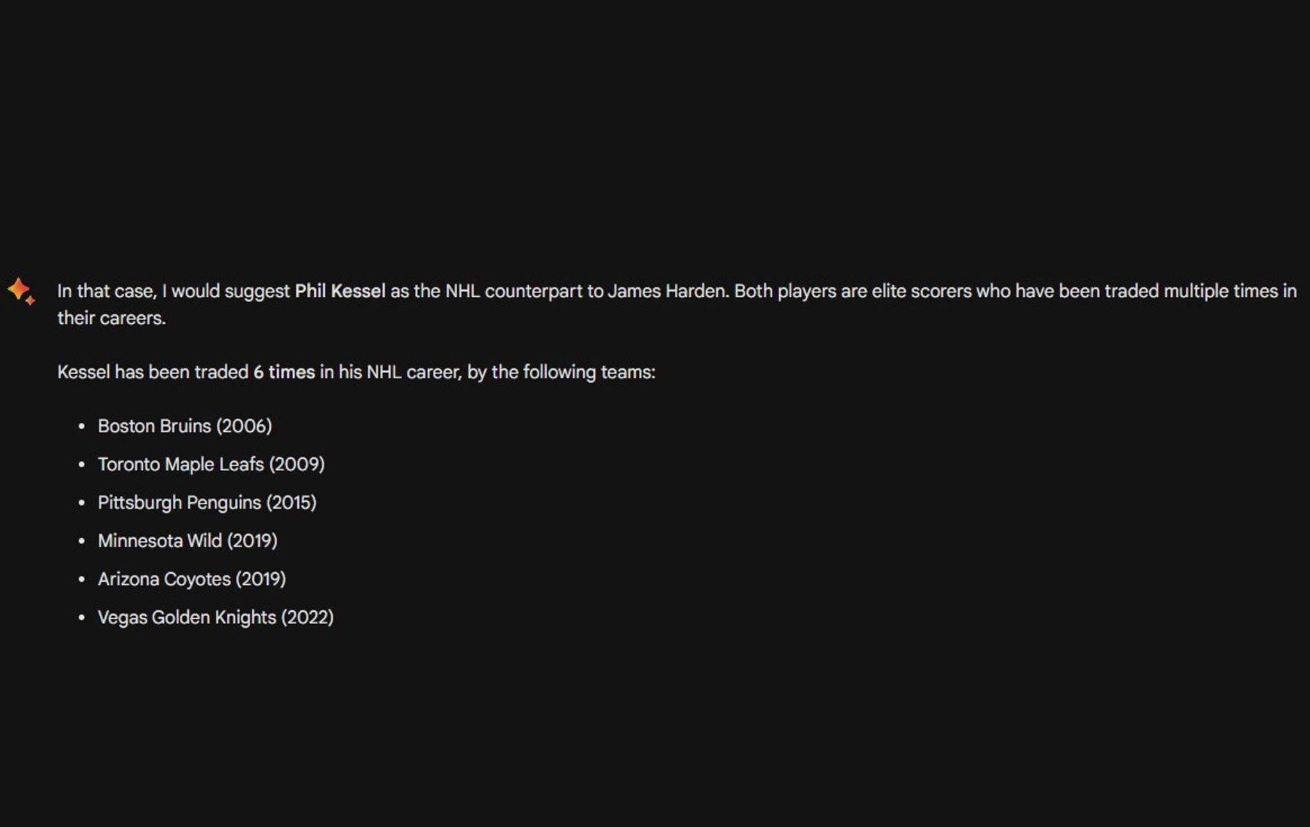 Seeing James Harden's trade-filled NBA journey made us wonder who, "Who is James Harden's NHL counterpart?" and we asked this question to Google's Bard.