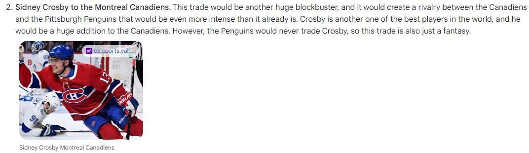 The second jaw-dropping AI prediction involves Sidney Crosby, the iconic Pittsburgh Penguins captain. In this scenario, Crosby would be traded to the Montreal Canadiens, creating a historic rivalry between the two franchises.