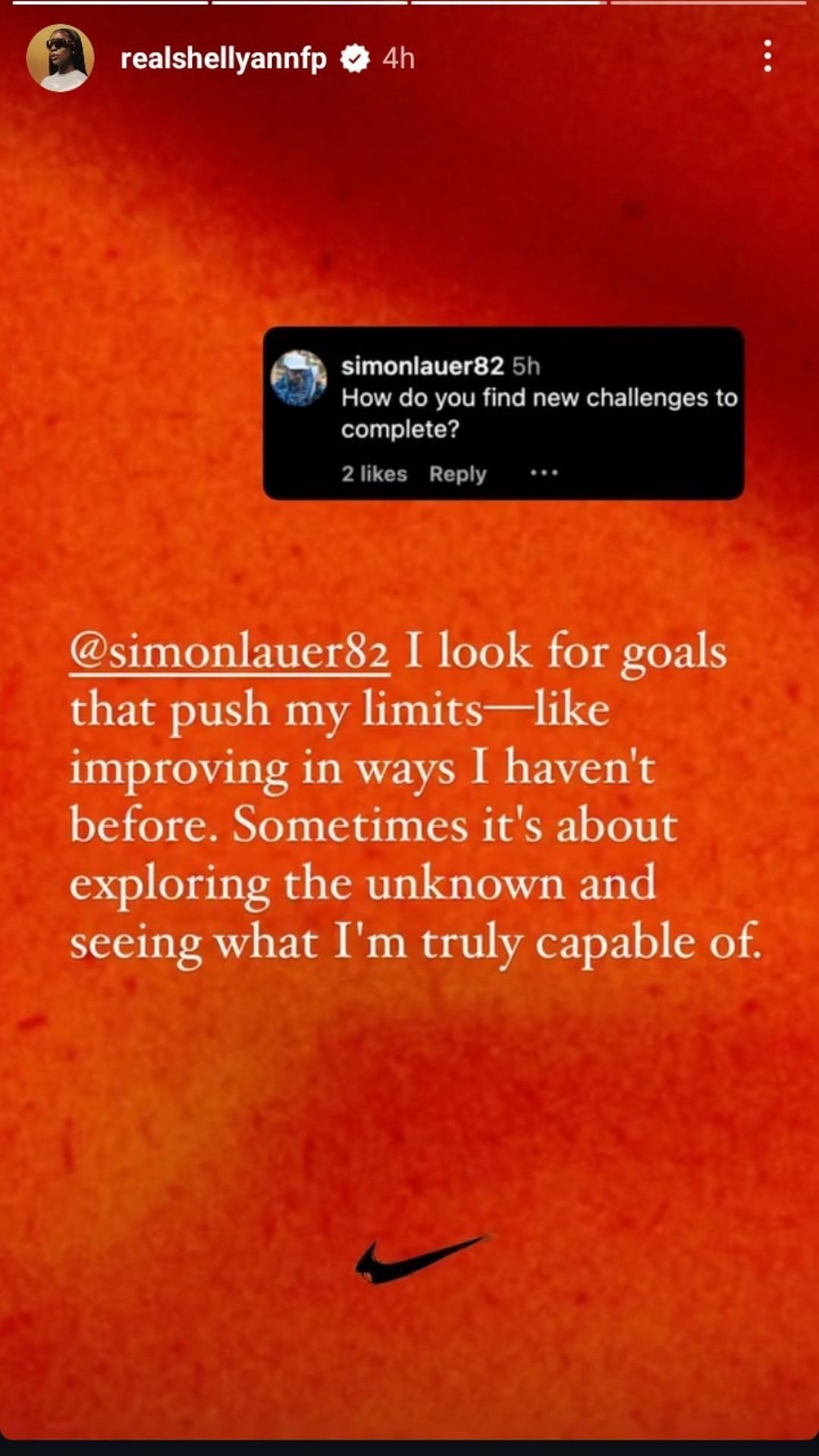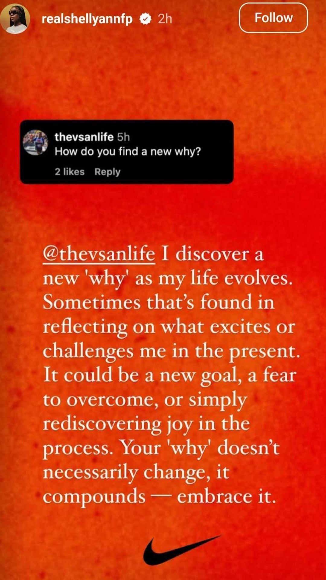 Recently, Fraser-Pryce responded to a fan via Instagram story, who asked her how she discovers her ‘why’ in life. Answering the question the athlete wrote:
