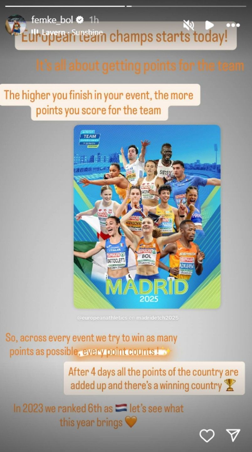 "European Team Champs starts from today, it's all about getting points for the team. The higher you finish in your event, the more points you score for the team. So across every event we try to win as many point as possible, every point counts!! After four days all the points of the country are added up and there's a winning country. In 2023 we ranked 6th as let's see what this year brings," Bol shared on her Instagram story.