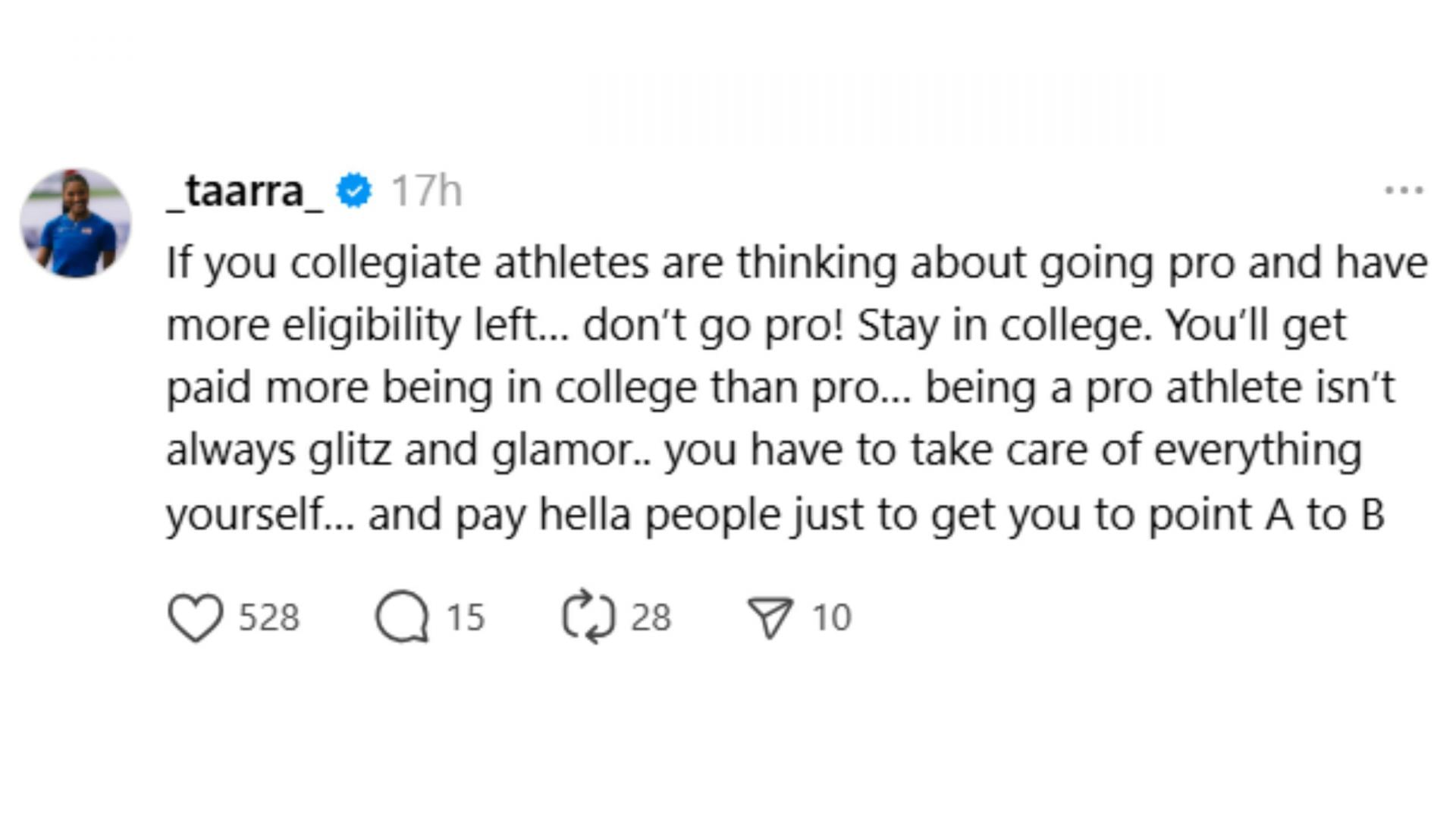 “If you collegiate athletes are thinking about going pro and have more eligibility left… don’t go pro! Stay in college. You’ll get paid more being in college than pro… being a pro athlete isn’t always glitz and glamor… you have to take care of everything yourself… and pay hella people just to get you to point A to B,” Davis-Woodhall posted via Threads.