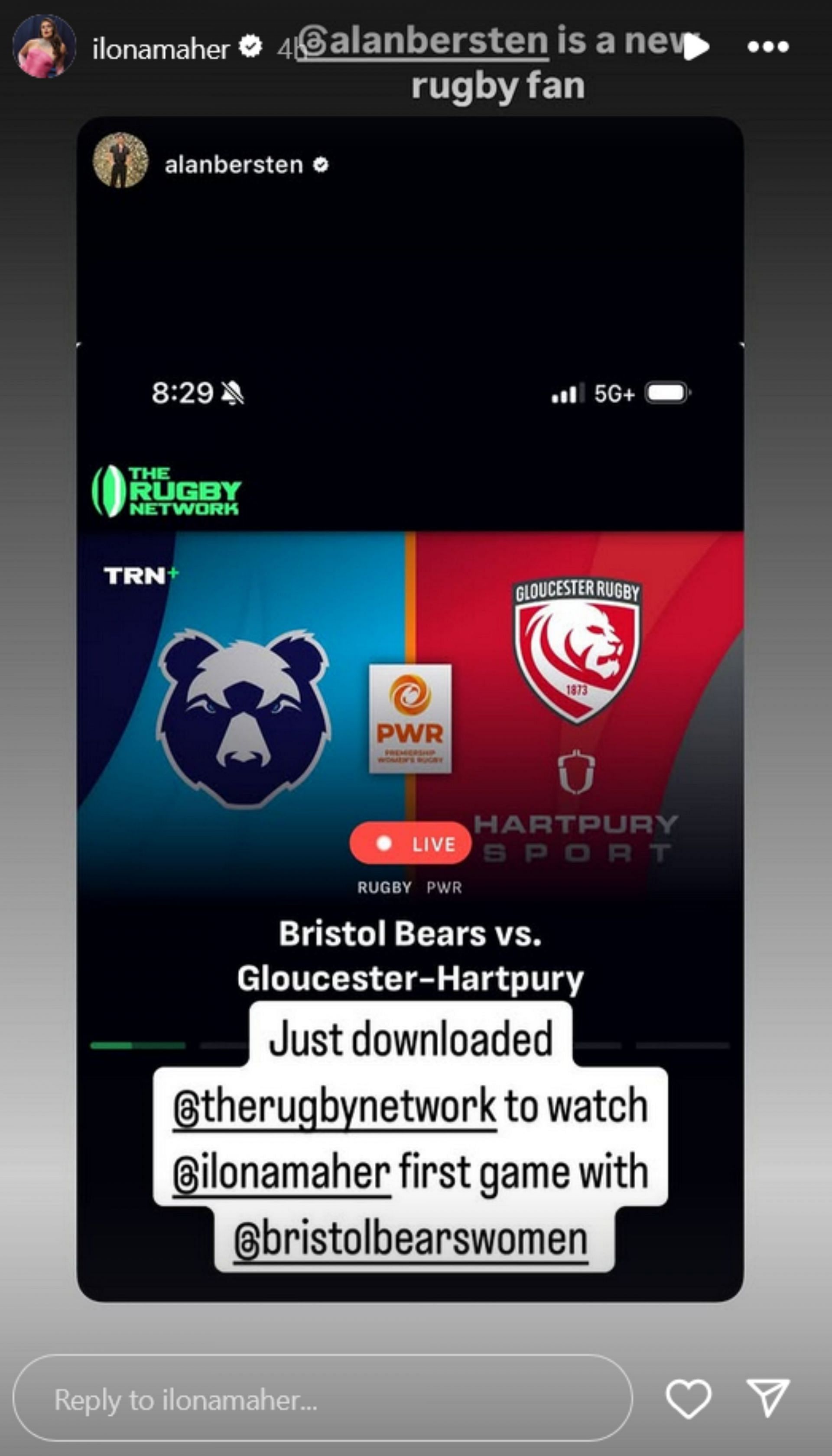 “Just downloaded @therugbynetwork to watch @ilonamaher first game with @bristolbearswomen"