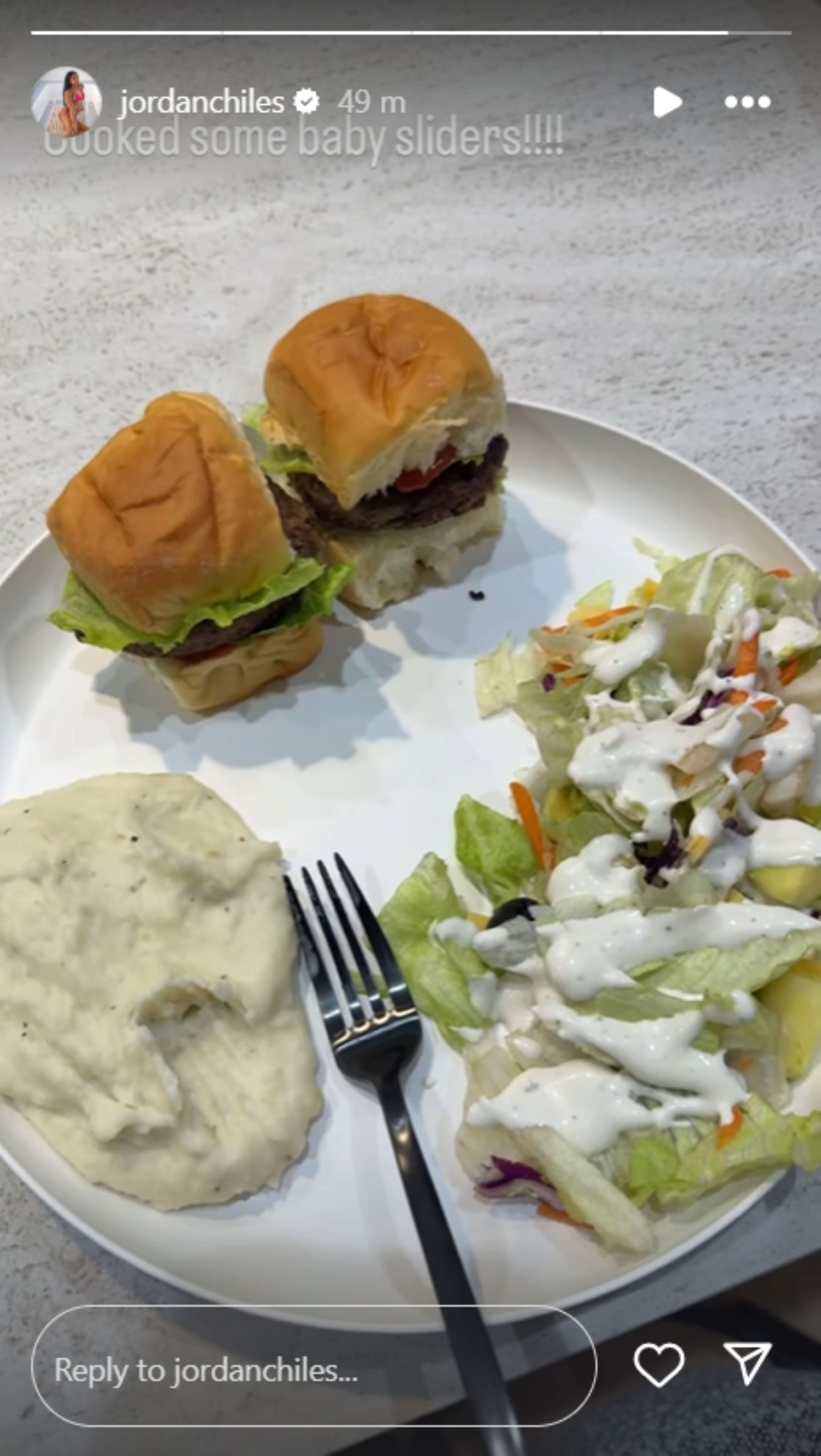 In a recent Instagram story, she enjoyed some time with herself in the kitchen, making some sliders. The plate featured two mini sliders, a portion of caesar salad and mashed potatoes.