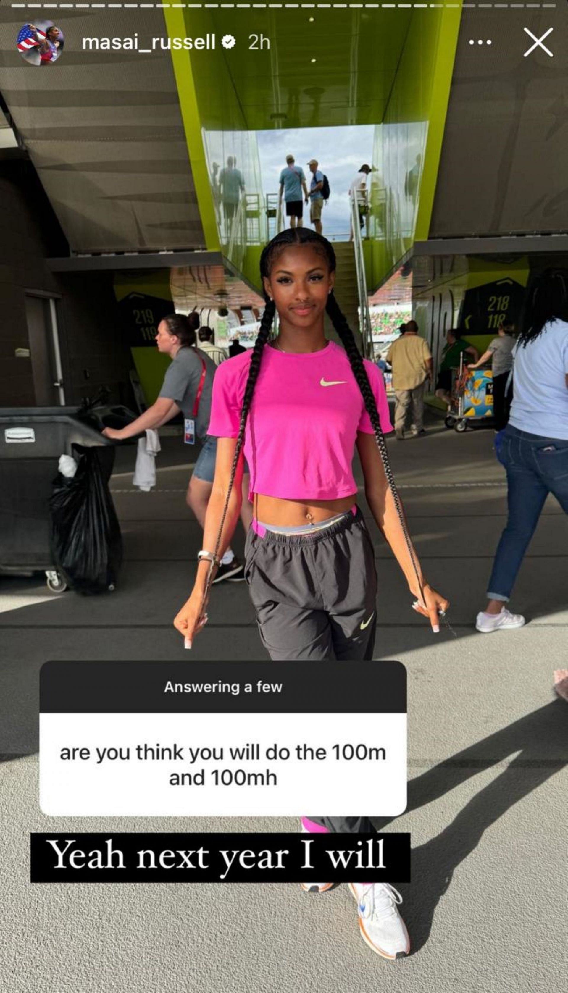 Shortly after, when asked about her chances in the 100m and 100m hurdles, she confirmed that she would run in both the next year, as posted in her Instagram story.