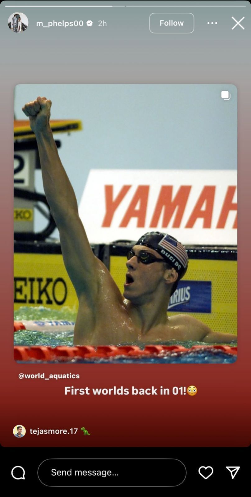 In a story shared on Instagram, Phelps reacted to a post made by World Aquatics, which featured a 16-year-old Phelps at the 2001 World Championships in Fukuoka, Japan.