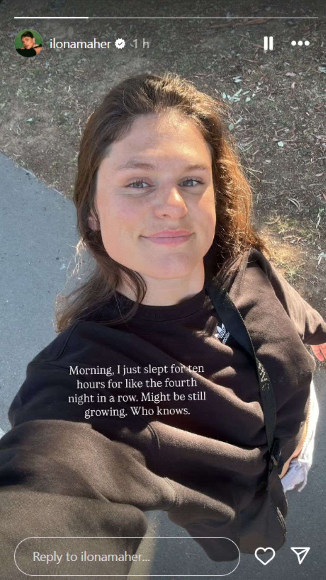 She added a humorous note to this by associating it with teenagers who often sleep a lot during growth spurts. On her Instagram story, Maher posted a selfie in a black hoodie with the caption,